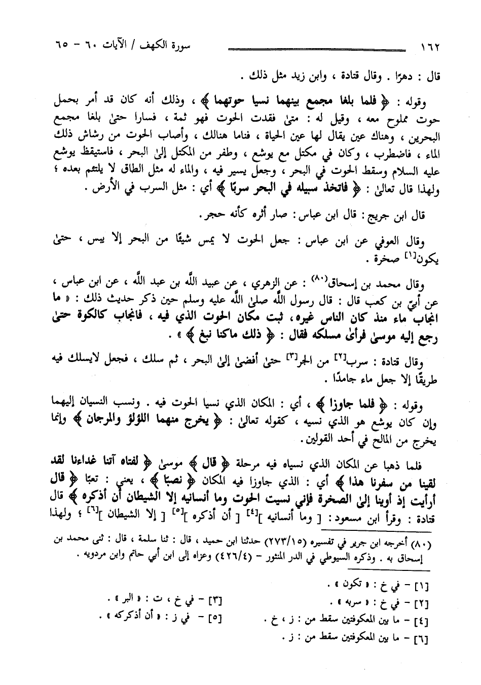 وَقَالَ الْعَوْفِيّ عَنْ اِبْن عَبَّاس جَعَلَ الْحُوت لَا يَمَسّ شَيْئًا مِنْ الْبَحْر إِلَّا يَبِسَ حَتَّى يَكُون صَخْرَة وَقَالَ مُحَمَّد بْن إِسْحَاق عَنْ الزُّهْرِيّ عَنْ عُبَيْد اللَّه بْن عَبْد اللَّه عَنْ اِبْن عَبَّاس عَنْ أُبَيّ بْن كَعْب قَالَ : قَالَ رَسُول اللَّه صَلَّى اللَّه عَلَيْهِ وَسَلَّمَ حِين ذَكَرَ حَدِيث ذَلِكَ مَا اِنْجَابَ مَاء مُنْذُ كَانَ النَّاس غَيْر مَسِير مَكَان الْحُوت الَّذِي فِيهِ فَانْجَابَ كَالْكُوَّةِ حَتَّى رَجَعَ إِلَيْهِ مُوسَى فَرَأَى مَسْلَكه فَقَالَ " ذَلِكَ مَا كُنَّا نَبْغِ " وَقَالَ قَتَادَة سَرَبَ مِنْ الْبَحْر حَتَّى أَفْضَى إِلَى الْبَحْر ثُمَّ سَلَكَ فِيهِ فَجَعَلَ لَا يَسْلُك فِيهِ طَرِيقًا إِلَّا صَارَ مَاء جَامِدًا .