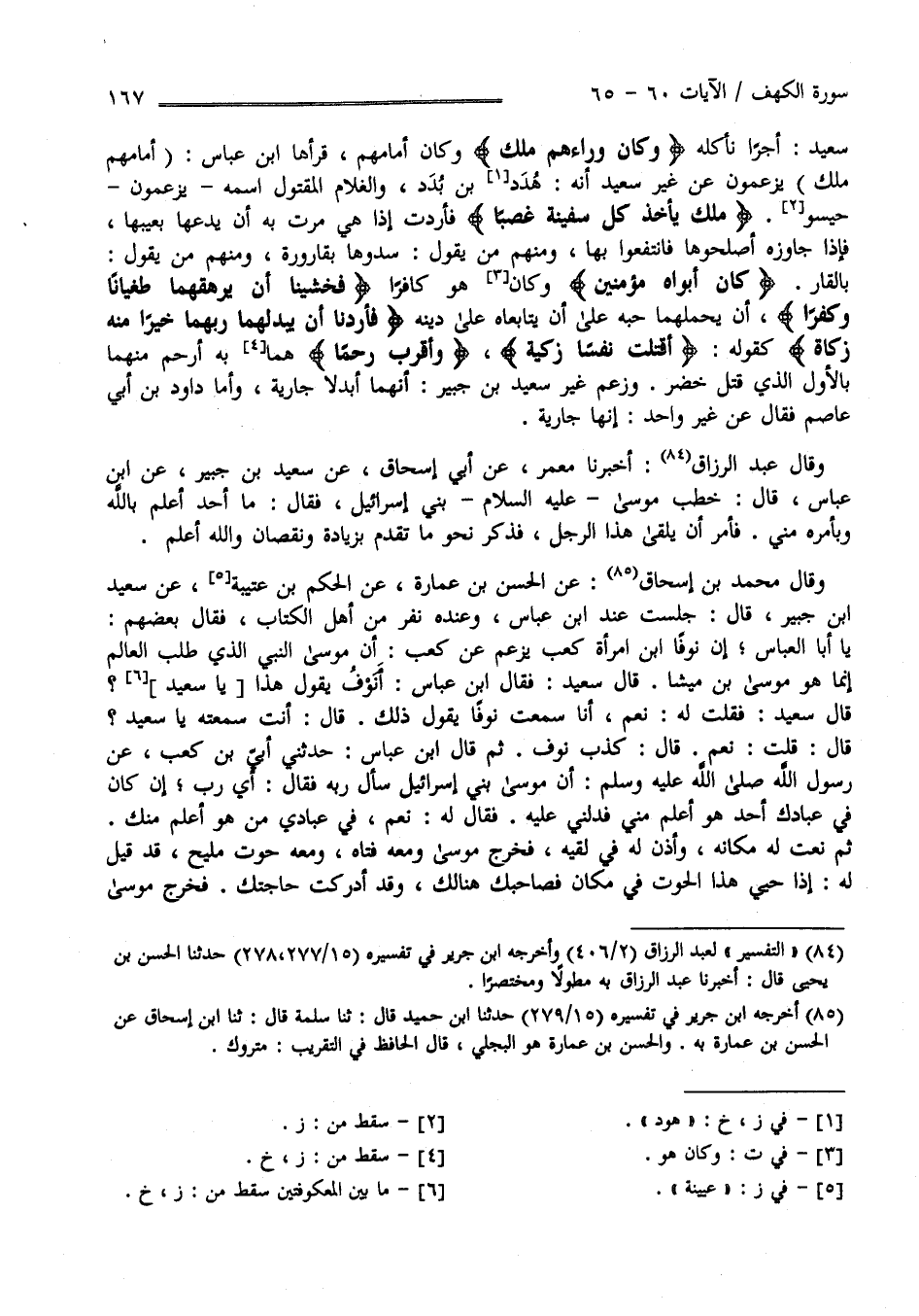 سَعِيد أَجْرًا نَأْكُلهُ وَكَانَ وَرَاءَهُمْ مَلِك وَكَانَ أَمَامهمْ قَرَأَهَا اِبْن عَبَّاس أَمَامهمْ مَلِك يَزْعُمُونَ عَنْ غَيْر سَعِيد أَنَّهُ هدد بْن بدد وَالْغُلَام الْمَقْتُول اِسْمه يَزْعُمُونَ حيسور مَلِك يَأْخُذ كُلّ سَفِينَة غَصْبًا فَأَرَدْت إِذَا هِيَ مَرَّتْ بِهِ أَنْ يَدَعهَا بِعَيْبِهَا فَإِذَا جَاوَزُوا أَصْلَحُوهَا فَانْتَفَعُوا بِهَا مِنْهُمْ مَنْ يَقُول سَدُّوهَا بِقَارُورَةٍ وَمِنْهُمْ مَنْ يَقُول بِالْقَارِ كَانَ أَبَوَاهُ مُؤْمِنَيْنِ وَكَانَ هُوَ كَافِرًا فَخَشِينَا أَنْ يُرْهِقهُمَا طُغْيَانًا وَكُفْرًا أَنْ يَحْمِلهُمَا حُبّه عَلَى أَنْ يُتَابِعَاهُ عَلَى دِينه فَأَرَدْنَا أَنْ يُبْدِلهُمَا رَبّهمَا خَيْرًا مِنْهُ زَكَاة كَقَوْلِهِ " أَقَتَلْت نَفْسًا زَكِيَّة " وَقَوْله " وَأَقْرَب رُحْمًا " هُمَا بِهِ أَرْحَم مِنْهُمَا بِالْأَوَّلِ الَّذِي قَتَلَ خَضِر وَزَعَمَ غَيْر سَعِيد بْن جُبَيْر أَنَّهُمَا أُبْدِلَا جَارِيَة وَأَمَّا دَاوُد بْن أَبِي عَاصِم فَقَالَ عَنْ غَيْر وَاحِد إِنَّهَا جَارِيَة .