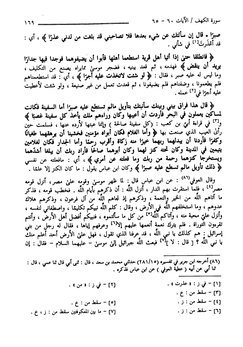 صَبْرًا قَالَ إِنْ سَأَلْتُك عَنْ شَيْء بَعْدهَا فَلَا تُصَاحِبنِي قَدْ بَلَغْت مِنْ لَدُنِّي عُذْرًا " أَيْ قَدْ أَعْذَرْت فِي شَأْنِي " فَانْطَلَقَا حَتَّى إِذَا أَتَيَا أَهْل قَرْيَة اِسْتَطْعَمَا أَهْلهَا فَأَبَوْا أَنْ يُضَيِّفُوهُمَا فَوَجَدَا فِيهَا جِدَارًا يُرِيد أَنْ يَنْقَضّ " فَهَدَمَهُ ثُمَّ قَعَدَ يَبْنِيه فَضَجِرَ مُوسَى مِمَّا يَرَاهُ يَصْنَع مِنْ التَّكْلِيف وَمَا لَيْسَ عَلَيْهِ صَبْر فَأَقَامَهُ قَالَ " لَوْ شِئْت لَاِتَّخَذْت عَلَيْهِ أَجْرًا " أَيْ قَدْ اِسْتَطْعَمْنَاهُمْ فَلَمْ يُطْعِمُونَا وَضِفْنَاهُمْ فَلَمْ يُضَيِّفُونَا ثُمَّ قَعَدْت تَعْمَل مِنْ غَيْر صَنِيعَة وَلَوْ شِئْت لَأُعْطِيت عَلَيْهِ أَجْرًا فِي عَمَله قَالَ " هَذَا فِرَاق بَيْنِي وَبَيْنك سَأُنَبِّئُك بِتَأْوِيلِ مَا لَمْ تَسْتَطِعْ عَلَيْهِ صَبْرًا أَمَّا السَّفِينَة فَكَانَتْ لِمَسَاكِين يَعْمَلُونَ فِي الْبَحْر فَأَرَدْت أَنْ أَعِيبهَا وَكَانَ وَرَاءَهُمْ مَلِك يَأْخُذ كُلّ سَفِينَة غَصْبًا " وَفِي قِرَاءَة أُبَيّ بْن كَعْب " كُلّ سَفِينَة صَالِحَة " وَإِنَّمَا عِبْتهَا لِأَرُدّهُ عَنْهَا فَسَلِمَتْ مِنْهُ حِين رَأَى الْعَيْب الَّذِي صَنَعْت بِهَا " وَأَمَّا الْغُلَام فَكَانَ أَبَوَاهُ مُؤْمِنَيْنِ فَخَشِينَا أَنْ يُرْهِقهُمَا طُغْيَانًا وَكُفْرًا فَأَرَدْنَا أَنْ يُبْدِلهُمَا رَبّهمَا خَيْرًا مِنْهُ زَكَاة وَأَقْرَب رُحْمًا وَأَمَّا الْجِدَار فَكَانَ لِغُلَامَيْنِ يَتِيمَيْنِ فِي الْمَدِينَة وَكَانَ تَحْته كَنْز لَهُمَا وَكَانَ أَبُوهُمَا صَالِحًا فَأَرَادَ رَبّك أَنْ يَبْلُغَا أَشَدّهمَا وَيَسْتَخْرِجَا كَنْزهمَا رَحْمَة مِنْ رَبّك وَمَا فَعَلْته عَنْ أَمْرِي " أَيْ مَا فَعَلْته عَنْ نَفْسِي " ذَلِكَ تَأْوِيل مَا لَمْ تَسْطِعْ عَلَيْهِ صَبْرًا " فَكَانَ اِبْن عَبَّاس يَقُول مَا كَانَ الْكَنْز إِلَّا عِلْمًا وَقَالَ الْعَوْفِيّ عَنْ اِبْن عَبَّاس قَالَ : لَمَّا ظَهَرَ مُوسَى وَقَوْمه عَلَى مِصْر أَنْزَلَ قَوْمه مِصْر فَلَمَّا اِسْتَقَرَّتْ بِهِمْ الدَّار أَنْزَلَ اللَّه أَنْ ذَكِّرْهُمْ بِأَيَّامِ اللَّه فَخَطَبَ قَوْمه فَذَكَرَ مَا آتَاهُمْ اللَّه مِنْ الْخَيْر وَالنِّعْمَة وَذَكَّرَهُمْ إِذْ نَجَّاهُمْ اللَّه مِنْ آلِ فِرْعَوْن وَذَكَّرَهُمْ هَلَاك عَدُوّهُمْ وَمَا اِسْتَخْلَفَهُمْ اللَّه فِي الْأَرْض وَقَالَ كَلَّمَ اللَّه نَبِيّكُمْ تَكْلِيمًا