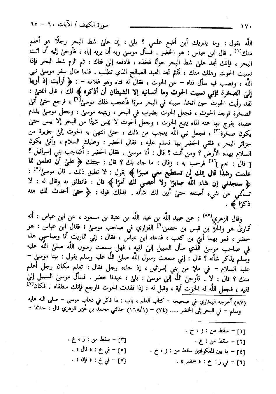 قَالَ اِبْن عَبَّاس : هُوَ الْخَضِر فَسَأَلَ مُوسَى رَبّه أَنْ يُرِيه إِيَّاهُ فَأَوْحَى إِلَيْهِ أَنْ اِئْتِ الْبَحْر فَإِنَّك تَجِد عَلَى شَطّ الْبَحْر حُوتًا فَخُذْهُ فَادْفَعْهُ إِلَى فَتَاك ثُمَّ اِلْزَمْ شَاطِئ الْبَحْر فَإِذَا نَسِيت الْحُوت وَهَلَكَ مِنْك فَثَمَّ تَجِد الْعَبْد الصَّالِح الَّذِي تَطْلُب فَلَمَّا طَالَ سَفَر مُوسَى نَبِيّ اللَّه وَنَصِبَ فِيهِ سَأَلَ فَتَاهُ عَنْ الْحُوت فَقَالَ لَهُ فَتَاهُ وَهُوَ غُلَامه " أَرَأَيْت إِذْ أَوَيْنَا إِلَى الصَّخْرَة فَإِنِّي نَسِيت الْحُوت وَمَا أَنْسَانِيهُ إِلَّا الشَّيْطَان أَنْ أَذْكُرهُ " لَك قَالَ الْفَتَى لَقَدْ رَأَيْت الْحُوت حِين اِتَّخَذَ سَبِيله فِي الْبَحْر سَرَبًا فَأُعْجِبَ ذَلِكَ فَرَجَعَ مُوسَى حَتَّى أَتَى الصَّخْرَة فَوَجَدَ الْحُوت فَجَعَلَ الْحُوت يَضْرِب فِي الْبَحْر وَيَتْبَعهُ مُوسَى وَجَعَلَ مُوسَى يُقَدِّم عَصَاهُ يُفَرِّج بِهَا عَنْهُ الْمَاء يَتْبَع الْحُوت وَجَعَلَ الْحُوت لَا يَمَسّ شَيْئًا مِنْ الْبَحْر إِلَّا يَبِسَ عَنْهُ الْمَاء حَتَّى يَكُون صَخْرَة فَجَعَلَ نَبِيّ اللَّه يَعْجَب مِنْ ذَلِكَ حَتَّى اِنْتَهَى بِهِ الْحُوت جَزِيرَة مِنْ جَزَائِر الْبَحْر فَلَقِيَ الْخَضِر بِهَا فَسَلَّمَ عَلَيْهِ فَقَالَ الْخَضِر وَعَلَيْك السَّلَام وَأَنَّى يَكُون السَّلَام بِهَذِهِ الْأَرْض وَمَنْ أَنْتَ ؟ قَالَ أَنَا مُوسَى .