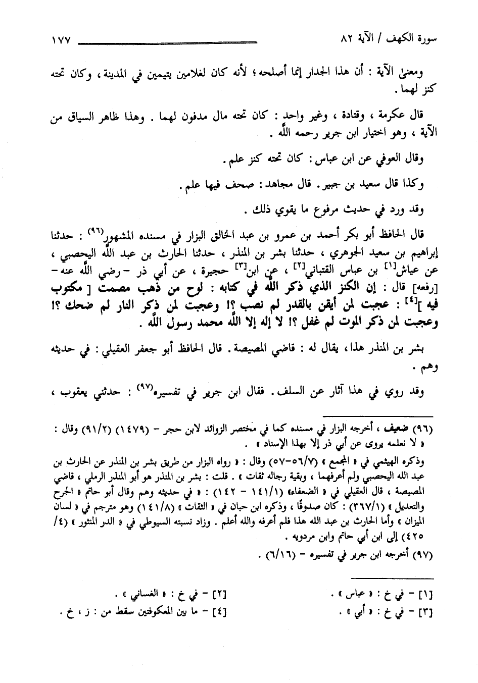 قَالَ الْحَافِظ أَبُو بَكْر أَحْمَد بْن عَمْرو بْن عَبْد الْخَالِق الْبَزَّار فِي مُسْنَده الْمَشْهُور حَدَّثَنَا إِبْرَاهِيم بْن سَعِيد الْجَوْهَرِيّ حَدَّثَنَا بِشْر بْن الْمُنْذِر حَدَّثَنَا الْحَارِث بْن عَبْد اللَّه الْيَحْصُبِيّ عَنْ عَيَّاش بْن عَبَّاس الْغَسَّانِيّ عَنْ أَبِي حُجَيْرَة عَنْ أَبِي ذَرّ رَفَعَهُ قَالَ : إِنَّ الْكَنْز الَّذِي ذَكَرَهُ اللَّه فِي كِتَابه لَوْح مِنْ ذَهَب مُصْمَت مَكْتُوب فِيهِ : عَجِبْت لِمَنْ أَيْقَنَ بِالْقَدَرِ لِمَ نَصِبَ وَعَجِبْت لِمَنْ ذَكَرَ النَّار لِمَ ضَحِكَ وَعَجِبْت لِمَنْ ذَكَرَ الْمَوْت لِمَ غَفَلَ لَا إِلَه إِلَّا اللَّه مُحَمَّد رَسُول اللَّه .