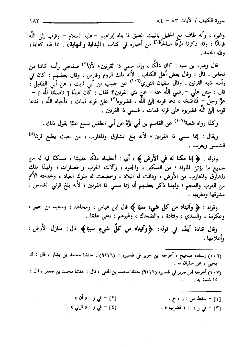 وَقَالَ وَهْب بْن مُنَبِّه : كَانَ مَلِكًا وَإِنَّمَا سُمِّيَ ذَا الْقَرْنَيْنِ لِأَنَّ صَفْحَتَيْ رَأْسه كَانَتَا مِنْ نُحَاس قَالَ : وَقَالَ بَعْض أَهْل الْكِتَاب لِأَنَّهُ مَلَكَ الرُّوم وَفَارِس وَقَالَ بَعْضهمْ كَانَ فِي رَأْسه شِبْه الْقَرْنَيْنِ وَقَالَ سُفْيَان الثَّوْرِيّ عَنْ حَبِيب بْن أَبِي ثَابِت عَنْ أَبِي الطُّفَيْل قَالَ : سُئِلَ عَلِيّ رَضِيَ اللَّه عَنْهُ عَنْ ذِي الْقَرْنَيْنِ فَقَالَ كَانَ عَبْدًا نَاصِحًا لِلَّهِ فَنَاصَحَهُ دَعَا قَوْمه إِلَى اللَّه فَضَرَبُوهُ عَلَى قَرْنه فَمَاتَ فَأَحْيَاهُ اللَّه فَدَعَا قَوْمه إِلَى اللَّه فَضَرَبُوهُ عَلَى قَرْنه فَمَاتَ فَسُمِّيَ ذَا الْقَرْنَيْنِ وَكَذَا رَوَاهُ شُعْبَة عَنْ الْقَاسِم بْن أَبِي بَزَّة عَنْ أَبِي الطُّفَيْل سَمِعَ عَلِيًّا يَقُول ذَلِكَ وَيُقَال إِنَّهُ إِنَّمَا سُمِّيَ ذَا الْقَرْنَيْنِ لِأَنَّهُ بَلَغَ الْمَشَارِق وَالْمَغَارِب مِنْ حَيْثُ يَطْلُع قَرْن الشَّمْس وَيَغْرُب .