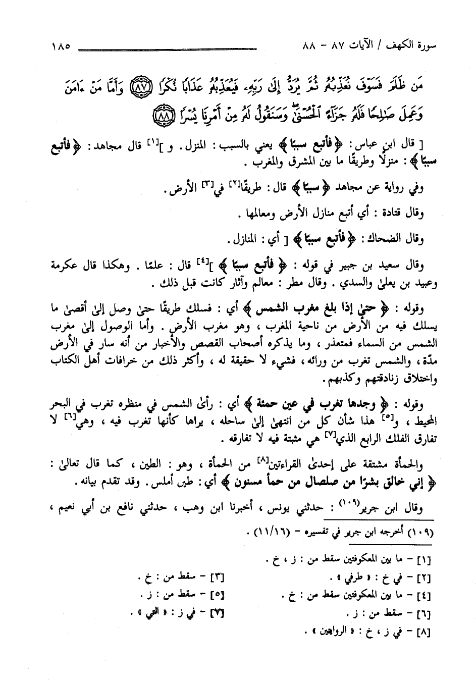 وَقَوْله : " حَتَّى إِذَا بَلَغَ مَغْرِب الشَّمْس " أَيْ فَسَلَكَ طَرِيقًا حَتَّى وَصَلَ إِلَى أَقْصَى مَا يُسْلَك فِيهِ مِنْ الْأَرْض مِنْ نَاحِيَة الْمَغْرِب وَهُوَ مَغْرِب الْأَرْض وَأَمَّا الْوُصُول إِلَى مَغْرِب الشَّمْس مِنْ السَّمَاء فَمُتَعَذِّر وَمَا يَذْكُرهُ أَصْحَاب الْقَصَص وَالْأَخْبَار مِنْ أَنَّهُ سَارَ فِي الْأَرْض مُدَّة وَالشَّمْس تَغْرُب مِنْ وَرَائِهِ فَشَيْء لَا حَقِيقَة لَهُ وَأَكْثَر ذَلِكَ مِنْ خُرَافَات أَهْل الْكِتَاب وَاخْتِلَاف زَنَادِقَتهمْ وَكَذِبهمْ وَقَوْله : " وَجَدَهَا تَغْرُب فِي عَيْن حَمِئَة " أَيْ رَأَى الشَّمْس فِي مَنْظَره تَغْرُب فِي الْبَحْر الْمُحِيط وَهَذَا شَأْن كُلّ مَنْ اِنْتَهَى إِلَى سَاحِله يَرَاهَا كَأَنَّهَا تَغْرُب فِيهِ وَهِيَ لَا تُفَارِق الْفَلَك الرَّابِع الَّذِي هِيَ مُثْبَتَة فِيهِ لَا تُفَارِقهُ وَالْحَمِئَة مُشْتَقَّة عَلَى إِحْدَى الْقِرَاءَتَيْنِ مِنْ الْحَمْأَة وَهُوَ الطِّين كَمَا قَالَ تَعَالَى : " إِنِّي خَالِق بَشَرًا مِنْ صَلْصَال مِنْ حَمَإٍ مَسْنُون " أَيْ طِين أَمْلَس وَقَدْ تَقَدَّمَ بَيَانه وَقَالَ اِبْن جَرِير : حَدَّثَنِي يُونُس أَخْبَرَنَا اِبْن وَهْب أَنْبَأَنَا نَافِع بْن أَبِي نُعَيْم