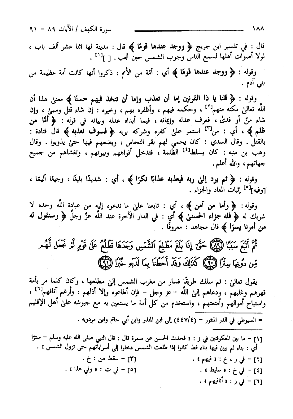 قَالَ فِي تَفْسِير اِبْن جُرَيْج " وَوَجَدَ عِنْدهَا قَوْمًا " قَالَ مَدِينَة لَهَا اِثْنَا عَشَر أَلْف بَاب لَوْلَا أَصْوَات أَهْلهَا لَسَمِعَ النَّاس وُجُوب الشَّمْس حِين تَجِب وَقَوْله : " وَوَجَدَ عِنْدهَا قَوْمًا " أَيْ أُمَّة مِنْ الْأُمَم ذَكَرُوا أَنَّهَا كَانَتْ أُمَّة عَظِيمَة مِنْ بَنِي آدَم وَقَوْله " قُلْنَا يَا ذَا الْقَرْنَيْنِ إِمَّا أَنْ تُعَذِّب وَإِمَّا أَنْ تَتَّخِذ فِيهِمْ حُسْنًا " مَعْنَى هَذَا أَنَّ اللَّه تَعَالَى مَكَّنَهُ مِنْهُمْ وَحَكَّمَهُ فِيهِمْ وَأَظْفَرَهُ بِهِمْ وَخَيَّرَهُ إِنْ شَاءَ قَتَلَ وَسَبَى وَإِنْ شَاءَ مَنَّ أَوْ فَدَى فَعُرِفَ عَدْله وَإِيمَانه فِيمَا أَبَدَاهُ عَدْله وَبَيَانه .
