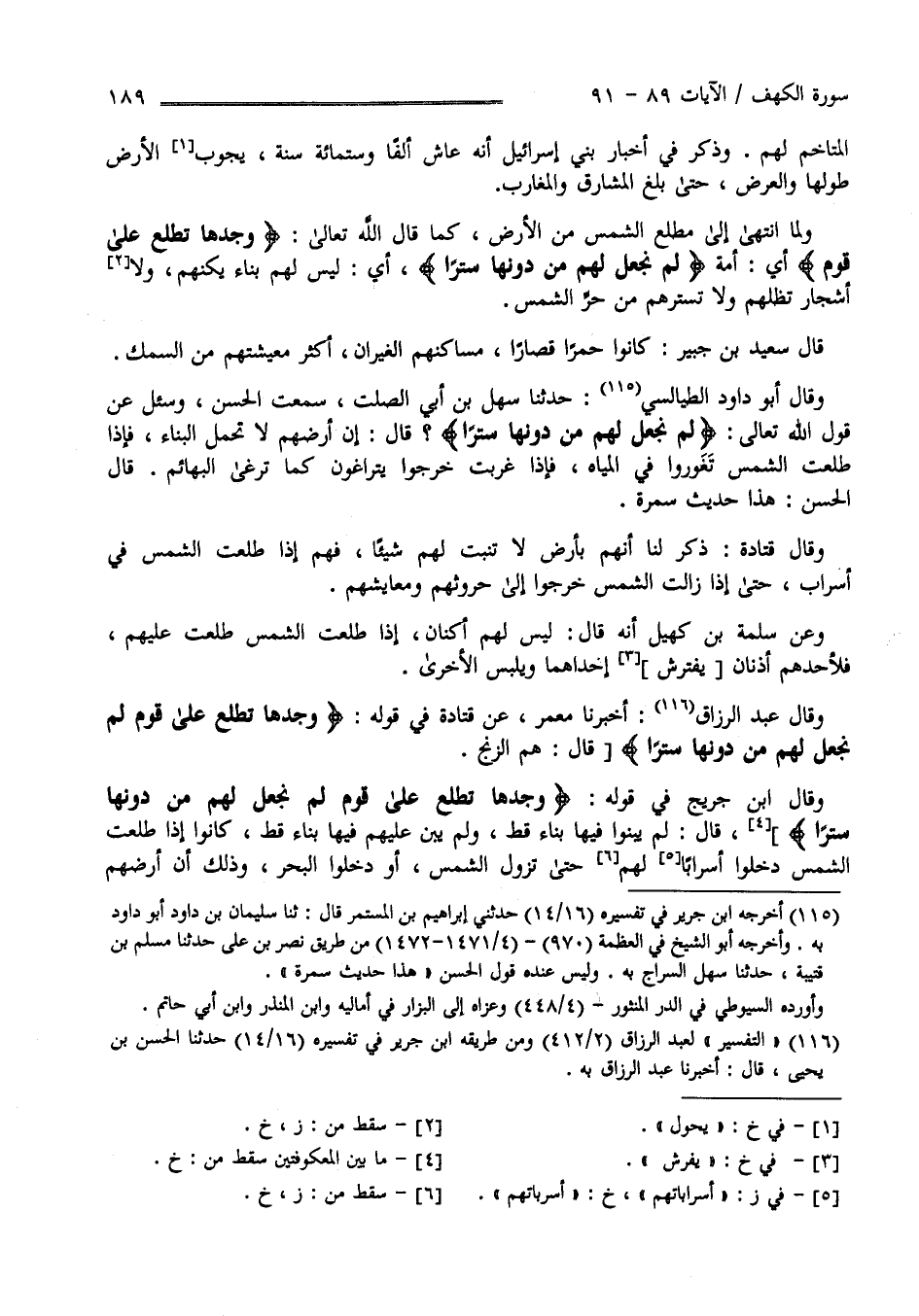 قَالَ عَبْد الرَّزَّاق : أَخْبَرَنَا مَعْمَر عَنْ قَتَادَة فِي قَوْله : " وَجَدَهَا تَطْلُع عَلَى قَوْم لَمْ نَجْعَل لَهُمْ مِنْ دُونهَا سِتْرًا " قَالَ هُمْ الزِّنْج وَقَالَ اِبْن جَرِير فِي قَوْله " وَجَدَهَا تَطْلُع عَلَى قَوْم لَمْ نَجْعَل لَهُمْ مِنْ دُونهَا سِتْرًا " قَالَ لَمْ يَبْنُوا فِيهَا بِنَاء قَطُّ وَلَمْ يُبْنَ عَلَيْهِمْ فِيهَا بِنَاء قَطُّ كَانُوا إِذَا طَلَعَتْ الشَّمْس دَخَلُوا أَسْرَابًا لَهُمْ حَتَّى تَزُول الشَّمْس أَوْ دَخَلُوا الْبَحْر وَذَلِكَ أَنَّ أَرْضهمْ
