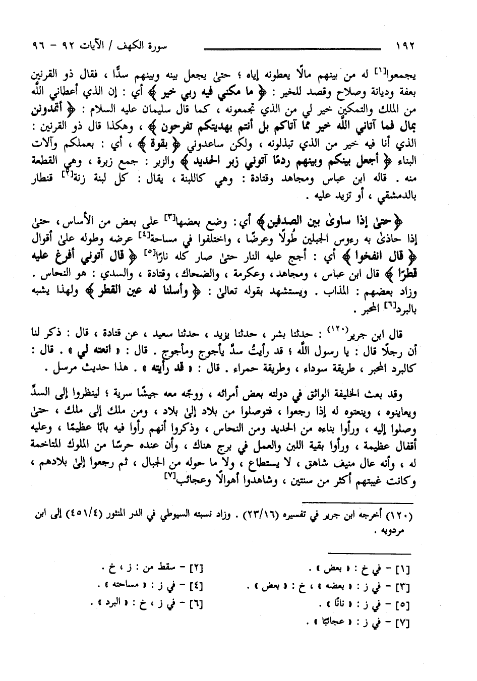 " أَجْعَل بَيْنكُمْ وَبَيْنهمْ رَدْمًا آتُونِي زُبُر الْحَدِيد " وَالزُّبُر جَمْع زُبْرَة وَهِيَ الْقِطْعَة مِنْهُ قَالَهُ اِبْن عَبَّاس وَمُجَاهِد وَقَتَادَة وَهِيَ كَاللَّبِنَةِ يُقَال كُلّ لَبِنَة زِنَة قِنْطَار بِالدِّمَشْقِيِّ أَوْ تَزِيد عَلَيْهِ " حَتَّى إِذَا سَاوَى بَيْن الصَّدَفَيْنِ " أَيْ وَضَعَ بَعْضه عَلَى بَعْض مِنْ الْأَسَاس حَتَّى إِذَا حَاذَى بِهِ رُءُوس الْجَبَلَيْنِ طُولًا وَعَرْضًا وَاخْتَلَفُوا فِي مِسَاحَة عَرْضه وَطُوله عَلَى أَقْوَال " قَالَ اُنْفُخُوا " أَيْ أَجَّجَ عَلَيْهِ النَّار حَتَّى صَارَ كُلّه نَارًا " قَالَ آتُونِي أُفْرِغ عَلَيْهِ قِطْرًا " قَالَ اِبْن عَبَّاس وَمُجَاهِد وَعِكْرِمَة وَالضَّحَّاك وَقَتَادَة وَالسُّدِّيّ هُوَ النُّحَاس زَادَ بَعْضهمْ الْمُذَاب وَيَسْتَشْهِد بِقَوْلِهِ تَعَالَى " وَأَسَلْنَا لَهُ عَيْن الْقِطْر " وَلِهَذَا يُشَبَّه بِالْبَرَدِ الْمُحَبَّر قَالَ اِبْن جَرِير : حَدَّثَنَا بِشْر بْن يَزِيد حَدَّثَنَا سَعِيد عَنْ قَتَادَة قَالَ : ذُكِرَ لَنَا أَنَّ رَجُلًا قَالَ يَا رَسُول اللَّه قَدْ رَأَيْت سَدّ يَأْجُوج وَمَأْجُوج قَالَ " اِنْعَتْهُ لِي " قَالَ كَالْبَرَدِ الْمُحَبَّر طَرِيقَة سَوْدَاء وَطَرِيقَة حَمْرَاء قَالَ " قَدْ رَأَيْته " هَذَا حَدِيث مُرْسَل .