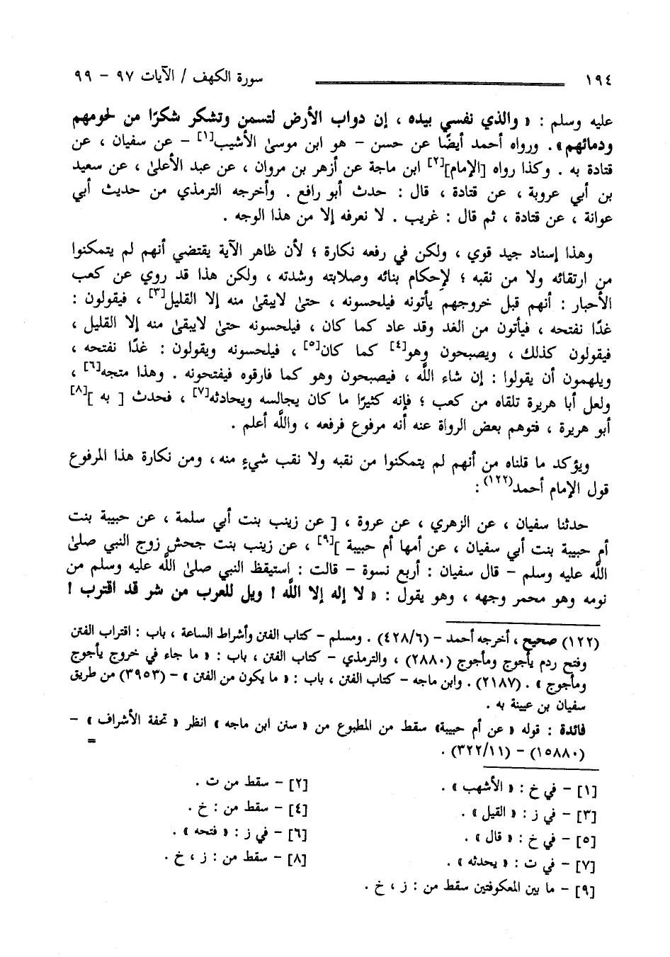 عَلَيْهِ وَسَلَّمَ " وَاَلَّذِي نَفْس مُحَمَّد بِيَدِهِ إِنَّ دَوَابّ الْأَرْض لَتَسْمَن وَتَشْكَر شَكَرًا مِنْ لُحُومهمْ وَدِمَائِهِمْ " وَرَوَاهُ أَحْمَد أَيْضًا عَنْ حَسَن هُوَ اِبْن مُوسَى الْأَشْهَب عَنْ سُفْيَان عَنْ قَتَادَة بِهِ وَكَذَا رَوَاهُ اِبْن مَاجَهْ عَنْ أَزْهَر بْن مَرْوَان عَنْ عَبْد الْأَعْلَى عَنْ سَعِيد بْن أَبِي عَرُوبَة عَنْ قَتَادَة قَالَ حَدَّثَ أَبُو رَافِع وَأَخْرَجَهُ التِّرْمِذِيّ مِنْ حَدِيث أَبِي عَوَانَة عَنْ قَتَادَة ثُمَّ قَالَ غَرِيب لَا يُعْرَف إِلَّا مِنْ هَذَا الْوَجْه وَإِسْنَاده جَيِّد قَوِيّ وَلَكِنَّ مَتْنه فِي رَفْعه نَكَارَة لِأَنَّ ظَاهِر الْآيَة يَقْتَضِي أَنَّهُمْ لَمْ يَتَمَكَّنُوا مِنْ اِرْتِقَائِهِ وَلَا مِنْ نَقْبه لِإِحْكَامِ بِنَائِهِ وَصَلَابَته وَشِدَّته وَلَكِنَّ هَذَا قَدْ رُوِيَ عَنْ كَعْب الْأَحْبَار أَنَّهُمْ قَبْل خُرُوجهمْ يَأْتُونَهُ فَيَلْحَسُونَهُ حَتَّى لَا يَبْقَى مِنْهُ إِلَّا الْقَلِيل فَيَقُولُونَ غَدًا نَفْتَحهُ فَيَأْتُونَ مِنْ الْغَد وَقَدْ عَادَ كَمَا كَانَ فَيَلْحَسُونَهُ حَتَّى لَا يَبْقَى مِنْهُ إِلَّا الْقَلِيل فَيَقُولُونَ كَذَلِكَ فَيُصْبِحُونَ وَهُوَ كَمَا كَانَ فَيَلْحَسُونَهُ وَيَقُولُونَ غَدًا نَفْتَحهُ وَيُلْهَمُونَ أَنْ يَقُولُوا إِنْ شَاءَ اللَّه فَيُصْبِحُونَ وَهُوَ كَمَا فَارَقُوهُ فَيَفْتَحُونَهُ وَهَذَا مُتَّجَه وَلَعَلَّ أَبَا هُرَيْرَة تَلَقَّاهُ مِنْ كَعْب فَإِنَّهُ كَانَ كَثِيرًا مَا كَانَ يُجَالِسهُ وَيُحَدِّثهُ فَحَدَّثَ بِهِ أَبُو هُرَيْرَة فَتَوَهَّمَ بَعْض الرُّوَاة عَنْهُ أَنَّهُ مَرْفُوع فَرَفَعَهُ وَاَللَّه أَعْلَم .