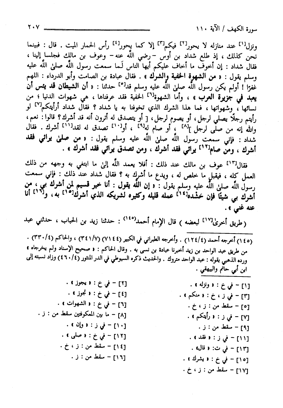 قَالَ فَبَيْنَمَا نَحْنُ كَذَلِكَ إِذْ طَلَعَ شَدَّاد بْن أَوْس رَضِيَ اللَّه عَنْهُ وَعَوْف بْن مَالِك فَجَلَسَا إِلَيْنَا فَقَالَ شَدَّاد إِنَّ أَخْوَف مَا أَخَاف عَلَيْكُمْ أَيّهَا النَّاس لَمَا سَمِعْت رَسُول اللَّه صَلَّى اللَّه عَلَيْهِ وَسَلَّمَ يَقُول : " مِنْ الشَّهْوَة الْخَفِيَّة وَالشِّرْك " فَقَالَ عُبَادَة بْن الصَّامِت وَأَبُو الدَّرْدَاء : اللَّهُمَّ غَفْرًا أَلَمْ يَكُنْ رَسُول اللَّه صَلَّى اللَّه عَلَيْهِ وَسَلَّمَ قَدْ حَدَّثَنَا أَنَّ الشَّيْطَان قَدْ يَئِسَ أَنْ يُعْبَد فِي جَزِيرَة الْعَرَب أَمَّا الشَّهْوَة الْخَفِيَّة فَقَدْ عَرَفْنَاهَا هِيَ شَهَوَات الدُّنْيَا مِنْ نِسَائِهَا وَشَهَوَاتهَا فَمَا هَذَا الشِّرْك الَّذِي تُخَوِّفنَا بِهِ يَا شَدَّاد ؟ فَقَالَ شَدَّاد : أَرَأَيْتُكُمْ لَوْ رَأَيْتُمْ رَجُلًا يُصَلِّي لِرَجُلٍ أَوْ يَصُوم لِرَجُلٍ أَوْ يَتَصَدَّق أَتَرَوْنَ أَنَّهُ قَدْ أَشْرَكَ ؟ قَالُوا نَعَمْ وَاَللَّه إِنَّ مَنْ صَلَّى أَوْ صَامَ أَوْ تَصَدَّقَ لَهُ لَقَدْ أَشْرَكَ فَقَالَ شَدَّاد فَإِنِّي سَمِعْت رَسُول اللَّه صَلَّى اللَّه عَلَيْهِ وَسَلَّمَ " مَنْ صَلَّى يُرَائِي فَقَدْ أَشْرَكَ وَمَنْ صَامَ يُرَائِي فَقَدْ أَشْرَكَ وَمَنْ تَصَدَّقَ يُرَائِي فَقَدْ أَشْرَكَ " قَالَ عَوْف بْن مَالِك عِنْد ذَلِكَ أَفَلَا يَعْمِد اللَّه إِلَى مَا اُبْتُغِيَ بِهِ وَجْهه مِنْ ذَلِكَ الْعَمَل كُلّه فَيَقْبَل مَا خَلَصَ لَهُ وَيَدَع مَا أُشْرِكَ بِهِ فَقَالَ شَدَّاد عِنْد ذَلِكَ فَإِنِّي سَمِعْت رَسُول اللَّه صَلَّى اللَّه عَلَيْهِ وَسَلَّمَ يَقُول : " إِنَّ اللَّه يَقُول أَنَا خَيْر قَسِيم لِمَنْ أَشْرَكَ بِي مَنْ أَشْرَكَ بِي شَيْئًا فَإِنَّ عَمَله قَلِيله وَكَثِيره لِشَرِيكِهِ الَّذِي أَشْرَكَ بِهِ أَنَا عَنْهُ غَنِيّ " " طَرِيق أُخْرَى لِبَعْضِهِ " قَالَ الْإِمَام أَحْمَد : حَدَّثَنَا زَيْد بْن الْحُبَاب حَدَّثَنِي عَبْد