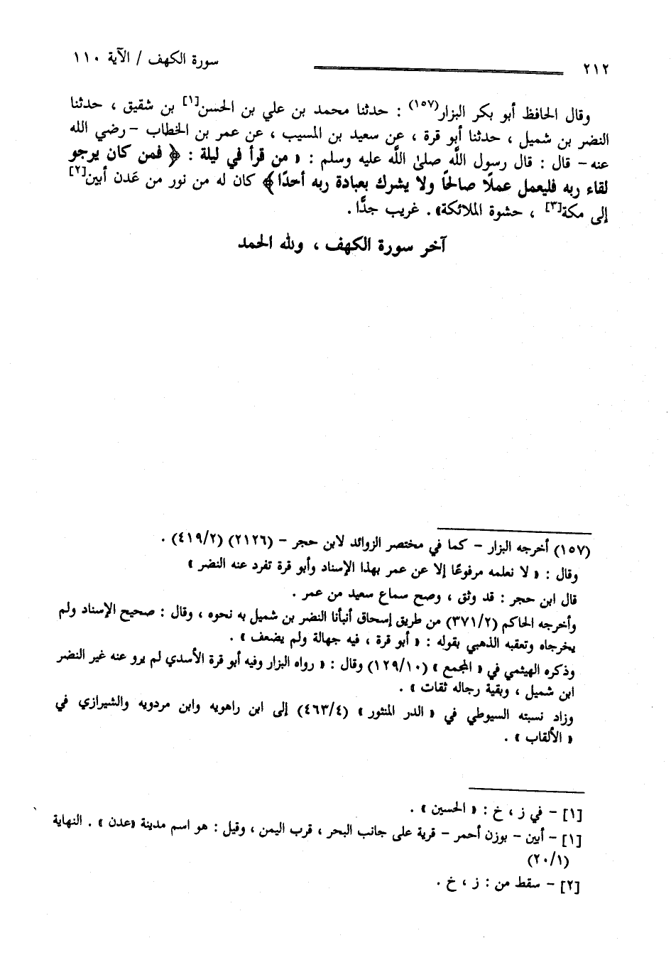 وَقَالَ الْحَافِظ أَبُو بَكْر الْبَزَّار : حَدَّثَنَا مُحَمَّد بْن عَلِيّ بْن الْحَسَن بْن شَقِيق حَدَّثَنَا النَّضْر بْن شُمَيْل حَدَّثَنَا أَبُو قُرَّة عَنْ سَعِيد بْن الْمُسَيِّب عَنْ عُمَر بْن الْخَطَّاب قَالَ قَالَ رَسُول اللَّه صَلَّى اللَّه عَلَيْهِ وَسَلَّمَ " مَنْ قَرَأَ فِي لَيْلَة " فَمَنْ كَانَ يَرْجُو لِقَاء رَبّه " كَانَ لَهُ مِنْ النُّور مِنْ عَدَن أَبْيَن إِلَى مَكَّة حَشْو ذَلِكَ النُّور الْمَلَائِكَة " غَرِيب جِدًّا .