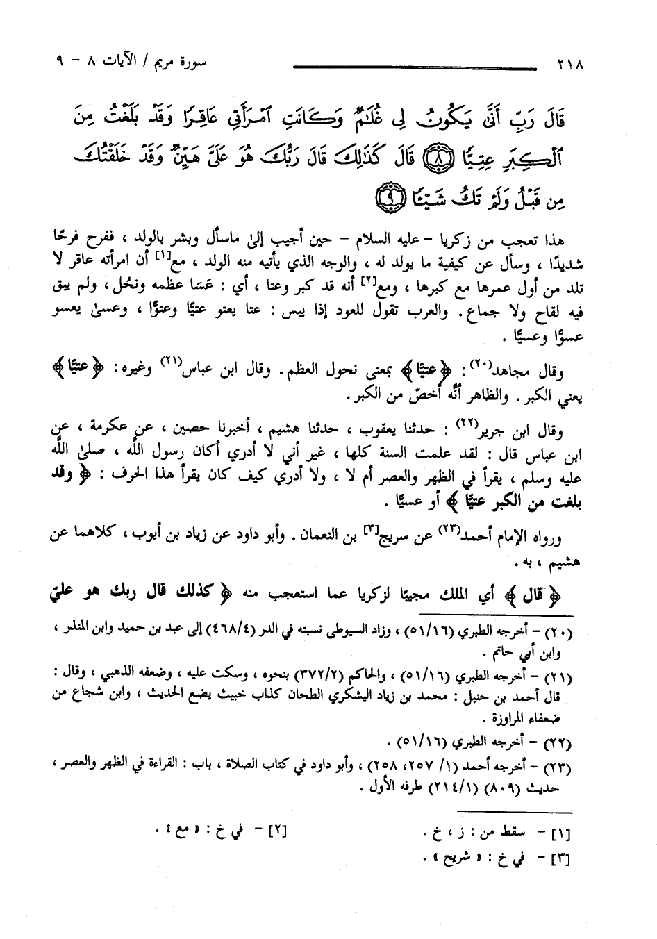 هَذَا تَعَجُّب مِنْ زَكَرِيَّا عَلَيْهِ السَّلَام حِين أُجِيبَ إِلَى مَا سَأَلَ وَبُشِّرَ بِالْوَلَدِ فَفَرِحَ فَرَحًا شَدِيدًا وَسَأَلَ عَنْ كَيْفِيَّة مَا يُولَد لَهُ وَالْوَجْه الَّذِي يَأْتِيه مِنْهُ الْوَلَد مَعَ أَنَّ اِمْرَأَته كَانَتْ عَاقِرًا لَمْ تَلِد مِنْ أَوَّل عُمْرهَا مَعَ كِبَرهَا وَمَعَ أَنَّهُ قَدْ كَبِرَ وَعَتَا أَيْ عَسَا عَظْمه وَنَحَلَ وَلَمْ يَبْقَ فِيهِ لِقَاح وَلَا جِمَاع وَالْعَرَب تَقُول لِلْعُودِ إِذَا يَبِسَ عِتِيًّا يَعْتُو عِتِيًّا وَعُتُوًّا وَعَسَا يَعْسُو عُسُوًّا وَعُسِيًّا وَقَالَ مُجَاهِد : عِتِيًّا يَعْنِي قُحُول الْعَظْم وَقَالَ اِبْن عَبَّاس وَغَيْره : عِتِيًّا يَعْنِي الْكِبَر وَالظَّاهِر أَنَّهُ أَخَصّ مِنْ الْكِبَر وَقَالَ اِبْن جَرِير : حَدَّثَنَا يَعْقُوب حَدَّثَنَا هُشَيْم أَخْبَرَنَا حُصَيْن عَنْ عِكْرِمَة عَنْ اِبْن عَبَّاس قَالَ لَقَدْ عَلِمْت السُّنَّة كُلّهَا غَيْر أَنِّي لَا أَدْرِي أَكَانَ رَسُول اللَّه صَلَّى اللَّه عَلَيْهِ وَسَلَّمَ يَقْرَأ فِي الظُّهْر وَالْعَصْر أَمْ لَا ؟ وَلَا أَدْرِي كَيْف كَانَ يَقْرَأ هَذَا الْحَرْف " وَقَدْ بَلَغْت مِنْ الْكِبَر عِتِيًّا " أَوْ عُسِيًّا .