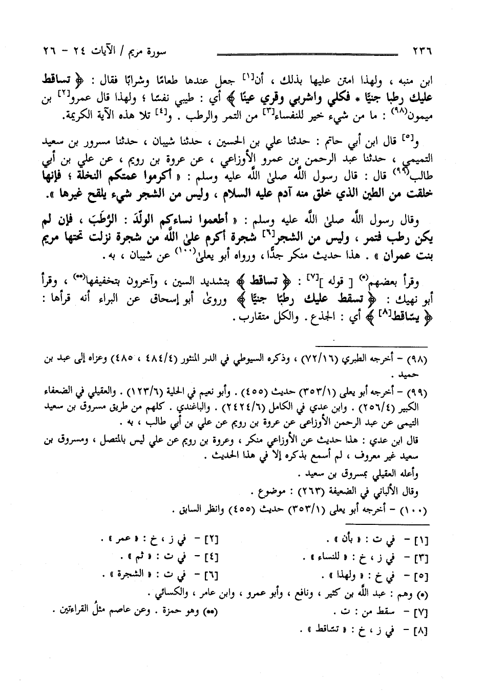 بْن مُنَبِّه وَلِهَذَا اِمْتَنَّ عَلَيْهَا بِذَلِكَ بِأَنْ جَعَلَ عِنْدهَا طَعَامًا وَشَرَابًا فَقَالَ " تُسَاقِط عَلَيْك رُطَبًا جَنِيًّا فَكُلِي وَاشْرَبِي وَقَرِّي عَيْنًا " أَيْ طِيبِي نَفْسًا وَلِهَذَا قَالَ عَمْرو بْن مَيْمُون : مَا مِنْ شَيْء خَيْر لِلنُّفَسَاءِ مِنْ التَّمْر وَالرُّطَب ثُمَّ تَلَا هَذِهِ الْآيَة الْكَرِيمَة وَقَالَ اِبْن أَبِي حَاتِم حَدَّثَنَا عَلِيّ بْن الْحُسَيْن حَدَّثَنَا شَيْبَان حَدَّثَنَا مَسْرُور بْن سَعِيد التَّمِيمِيّ حَدَّثَنَا عَبْد الرَّحْمَن بْن عَمْرو الْأَوْزَاعِيّ عَنْ عُرْوَة بْن رُوَيْم عَنْ عَلِيّ بْن أَبِي طَالِب قَالَ : قَالَ رَسُول اللَّه صَلَّى اللَّه عَلَيْهِ وَسَلَّمَ " أَكْرِمُوا عَمَّتكُمْ النَّخْلَة فَإِنَّهَا خُلِقَتْ مِنْ الطِّين الَّذِي خُلِقَ مِنْهُ آدَم عَلَيْهِ السَّلَام وَلَيْسَ مِنْ الشَّجَر شَيْء يُلَقَّح غَيْرهَا " وَقَالَ رَسُول اللَّه صَلَّى اللَّه عَلَيْهِ وَسَلَّمَ " أَطْعِمُوا نِسَاءَكُمْ الْوُلْد الرُّطَب فَإِنْ لَمْ يَكُنْ رُطَب فَتَمْر وَلَيْسَ مِنْ الشَّجَر شَجَرَة أَكْرَم عَلَى اللَّه مِنْ شَجَرَة نَزَلَتْ تَحْتهَا مَرْيَم بِنْت عِمْرَان " هَذَا حَدِيث مُنْكَر جِدًّا وَرَوَاهُ أَبُو يَعْلَى عَنْ شَيْبَان بِهِ وَقَرَأَ بَعْضهمْ " تَسَّاقَط " بِتَشْدِيدِ السِّين وَآخَرُونَ بِتَخْفِيفِهَا وَقَرَأَ أَبُو نَهِيك " تُسْقِط عَلَيْك رُطَبًا جَنِيًّا " وَرَوَى أَبُو إِسْحَاق عَنْ الْبَرَاء أَنَّهُ قَرَأَهَا " يَسَّاقَط " أَيْ الْجِذْع وَالْكُلّ مُتَقَارِب .