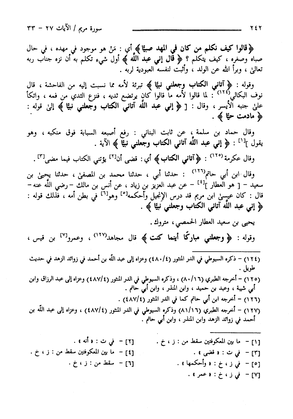 " قَالَ إِنِّي عَبْد اللَّه " أَوَّل شَيْء تَكَلَّمَ بِهِ أَنْ نَزَّهَ جَنَاب رَبّه تَعَالَى وَبَرَّأَهُ عَنْ الْوَلَد وَأَثْبَتَ لِنَفْسِهِ الْعُبُودِيَّة لِرَبِّهِ وَقَوْله : " آتَانِيَ الْكِتَاب وَجَعَلَنِي نَبِيًّا " تَبْرِئَة لِأُمِّهِ مِمَّا نُسِبَتْ إِلَيْهِ مِنْ الْفَاحِشَة قَالَ نَوْف الْبِكَالِيّ لَمَّا قَالُوا لِأُمِّهِ مَا قَالُوا كَانَ يَرْتَضِع ثَدْيهَا فَنَزَعَ الثَّدْي مِنْ فَمه وَاتَّكَأَ عَلَى جَنْبه الْأَيْسَر وَقَالَ " إِنِّي عَبْد اللَّه آتَانِيَ الْكِتَاب وَجَعَلَنِي نَبِيًّا - إِلَى قَوْله - مَا دُمْت حَيًّا " وَقَالَ حَمَّاد بْن سَلَمَة عَنْ ثَابِت الْبُنَانِيّ رَفَعَ أُصْبُعه السَّبَّابَة فَوْق مَنْكِبه وَهُوَ يَقُول : " إِنِّي عَبْد اللَّه آتَانِيَ الْكِتَاب وَجَعَلَنِي نَبِيًّا " الْآيَة وَقَالَ عِكْرِمَة " آتَانِيَ الْكِتَاب " أَيْ قَضَى أَنَّهُ يُؤْتِينِي الْكِتَاب فِيمَا قَضَى وَقَالَ اِبْن أَبِي حَاتِم حَدَّثَنَا أَبِي حَدَّثَنَا مُحَمَّد المصفى حَدَّثَنَا يَحْيَى بْن سَعِيد هُوَ الْعَطَّار عَنْ عَبْد الْعَزِيز بْن زِيَاد عَنْ أَنَس بْن مَالِك رَضِيَ اللَّه عَنْهُ قَالَ : كَانَ عِيسَى اِبْن مَرْيَم قَدْ دَرَسَ التَّوْرَاة وَأَحْكَمَهَا وَهُوَ فِي بَطْن أُمّه فَذَلِكَ قَوْله : " إِنِّي عَبْد اللَّه آتَانِيَ الْكِتَاب وَجَعَلَنِي نَبِيًّا " يَحْيَى بْن سَعِيد الْعَطَّار الْحِمْصِيّ مَتْرُوك .