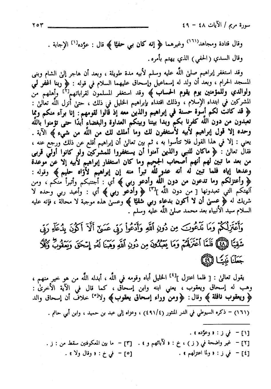 وَقَوْله " وَأَعْتَزِلكُمْ وَمَا تَدْعُونَ مِنْ دُون اللَّه وَأَدْعُو رَبِّي " أَيْ أَجْتَنِبكُمْ وَأَتَبَرَّأ مِنْكُمْ وَمِنْ آلِهَتكُمْ الَّتِي تَعْبُدُونَهَا مِنْ دُون اللَّه " وَأَدْعُو رَبِّي " أَيْ وَأَعْبُد رَبِّي وَحْده لَا شَرِيك لَهُ " عَسَى أَلَّا أَكُون بِدُعَاءِ رَبِّي شَقِيًّا " وَعَسَى هَذِهِ مُوجِبَة لَا مَحَالَة فَإِنَّهُ عَلَيْهِ السَّلَام سَيِّد الْأَنْبِيَاء بَعْد مُحَمَّد صَلَّى اللَّه عَلَيْهِ سَلَّمَ .