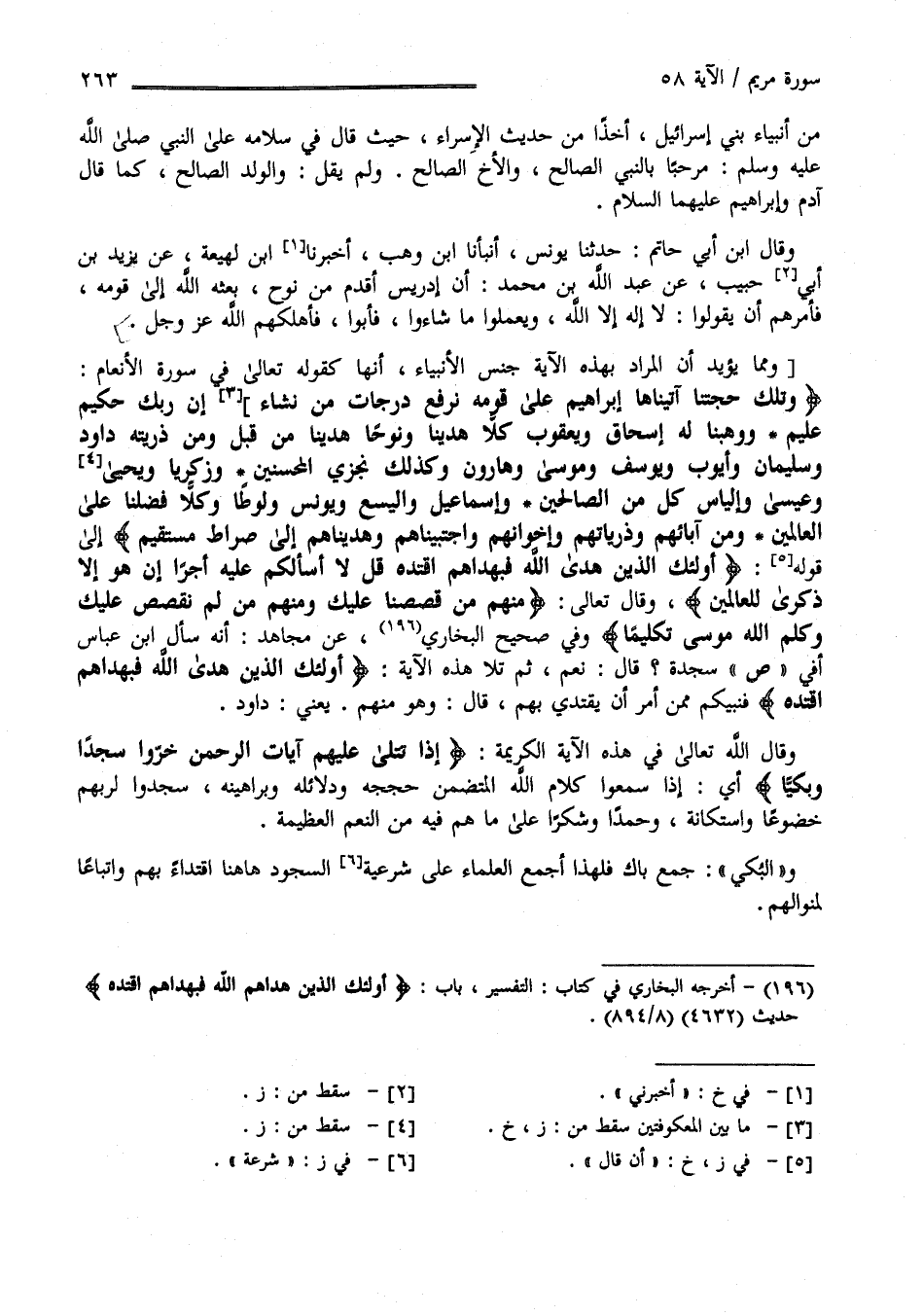 وَقَالَ اللَّه تَعَالَى فِي هَذِهِ الْآيَة الْكَرِيمَة " إِذَا تُتْلَى عَلَيْهِمْ آيَات الرَّحْمَن خَرُّوا سُجَّدًا وَبُكِيًّا " أَيْ إِذَا سَمِعُوا كَلَامِ اللَّه الْمُتَضَمِّن حُجَجه وَدَلَائِله وَبَرَاهِينه سَجَدُوا لِرَبِّهِمْ خُضُوعًا وَاسْتِكَانَة حَمْدًا وَشُكْرًا عَلَى مَا هُمْ فِيهِ مِنْ النِّعَم الْعَظِيمَة وَالْبُكِيّ جَمْع بَاكٍ فَلِهَذَا أَجْمَعَ الْعُلَمَاء عَلَى شَرْعِيَّة السُّجُود هَاهُنَا اِقْتِدَاء بِهِمْ وَاتِّبَاعًا لِمِنْوَالِهِمْ .