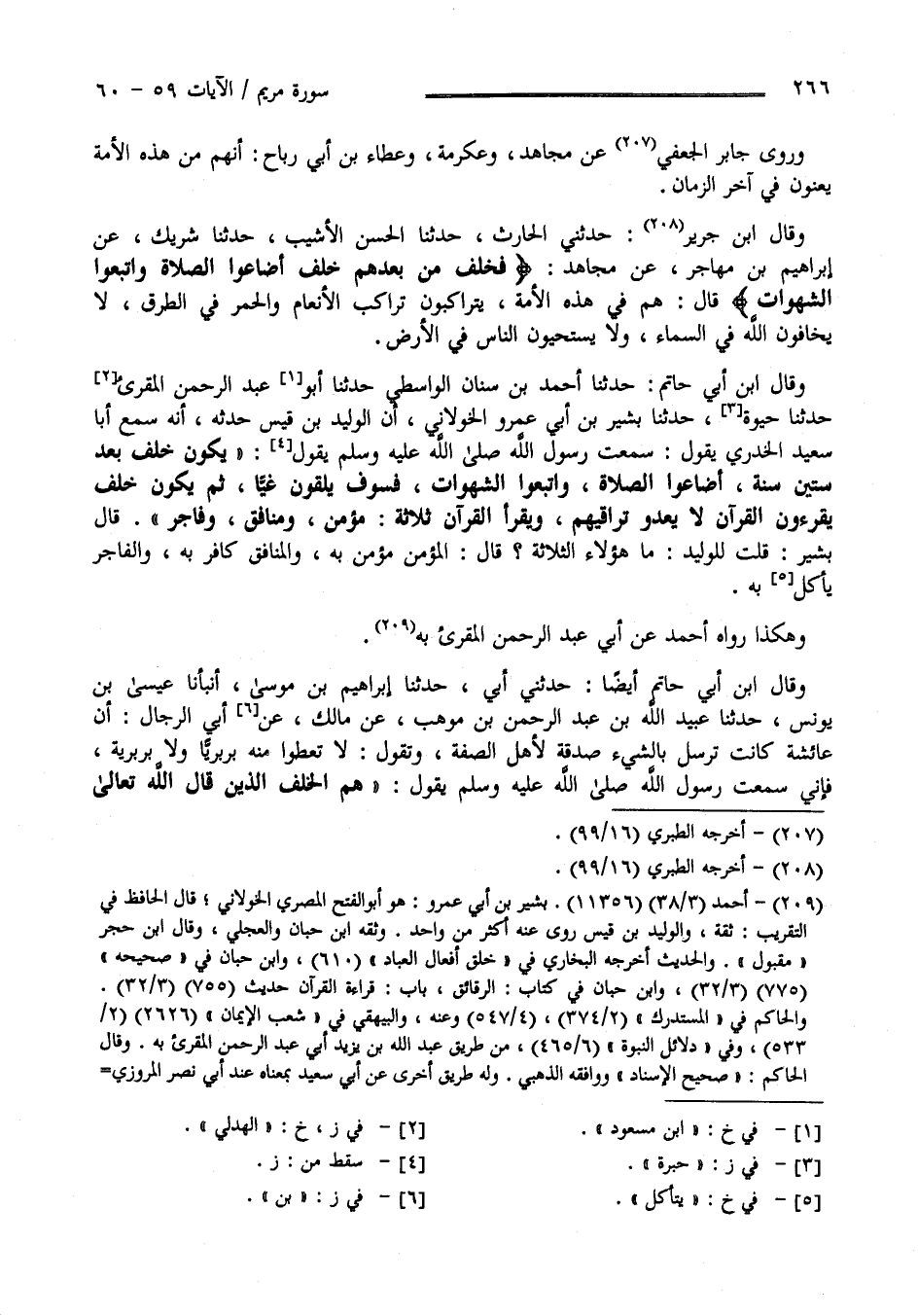 يَتَرَاكَبُونَ تَرَاكُب الْأَنْعَام وَالْحُمُر فِي الطُّرُق لَا يَخَافُونَ اللَّه فِي السَّمَاء وَلَا يَسْتَحْيُونَ مِنْ النَّاس فِي الْأَرْض وَقَالَ اِبْن أَبَى حَاتِم حَدَّثَنَا أَحْمَد بْن سِنَان الْوَاسِطِيّ حَدَّثَنَا أَبُو عَبْد الرَّحْمَن الْمُقْرِي حَدَّثَنَا حَيْوَة حَدَّثَنَا بَشِير بْن أَبِي عَمْرو الْخَوْلَانِيّ أَنَّ الْوَلِيد بْن قَيْس حَدَّثَهُ أَنَّهُ سَمِعَ أَبَا سَعِيد الْخُدْرِيّ يَقُول : سَمِعْت رَسُول اللَّه صَلَّى اللَّه عَلَيْهِ وَسَلَّمَ يَقُول " يَكُون خَلْف بَعْد سِتِّينَ سَنَة أَضَاعُوا الصَّلَاة وَاتَّبَعُوا الشَّهَوَات فَسَوْفَ يَلْقَوْنَ غَيًّا ثُمَّ يَكُون خَلْف يَقْرَءُونَ الْقُرْآن لَا يَعْدُو تَرَاقِيهمْ وَيَقْرَأ الْقُرْآن ثَلَاثَة مُؤْمِن وَمُنَافِق وَفَاجِر " وَقَالَ بَشِير قُلْت لِلْوَلِيدِ مَا هَؤُلَاءِ الثَّلَاثَة ؟ قَالَ الْمُؤْمِن مُؤْمِن بِهِ وَالْمُنَافِق كَافِر بِهِ وَالْفَاجِر يَأْكُل بِهِ وَهَكَذَا رَوَاهُ أَحْمَد عَنْ أَبِي عَبْد الرَّحْمَن الْمُقْرِي وَقَالَ اِبْن أَبِي حَاتِم أَيْضًا حَدَّثَنِي أَبِي حَدَّثَنَا إِبْرَاهِيم بْن مُوسَى أَنْبَأَنَا عِيسَى بْن يُونُس حَدَّثَنَا عُبَيْد اللَّه بْن عَبْد الرَّحْمَن بْن وَهْب عَنْ مَالِك عَنْ أَبِي الرِّجَال أَنَّ عَائِشَة كَانَتْ تُرْسِل بِالشَّيْءِ صَدَقَة لِأَهْلِ الصُّفَّة وَتَقُول لَا تُعْطُوا مِنْهُ بَرْبَرِيًّا وَلَا بَرْبَرِيَّة فَإِنِّي سَمِعْت رَسُول اللَّه صَلَّى اللَّه عَلَيْهِ وَسَلَّمَ يَقُول " هُمْ الْخَلْف الَّذِينَ قَالَ اللَّه تَعَالَى