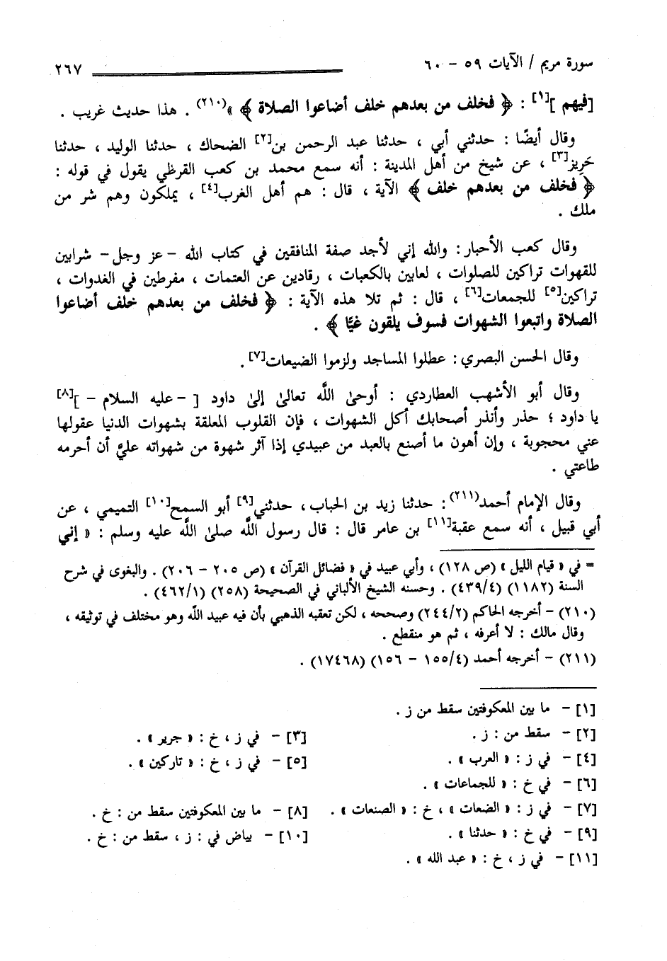 فِيهِمْ فَخَلَفَ مِنْ بَعْدهمْ خَلْف أَضَاعُوا الصَّلَاة " هَذَا حَدِيث غَرِيب وَقَالَ أَيْضًا حَدَّثَنِي أَبِي حَدَّثَنَا عَبْد الرَّحْمَن بْن الضَّحَّاك حَدَّثَنَا الْوَلِيد بْن جَرِير عَنْ شَيْخ مِنْ أَهْل الْمَدِينَة أَنَّهُ سَمِعَ مُحَمَّد بْن كَعْب الْقُرَظِيّ يَقُول فِي قَوْل اللَّه " فَخَلَفَ مِنْ بَعْدهمْ خَلْف " الْآيَة قَالَ هُمْ أَهْل الْغَرْب يَمْلِكُونَ وَهُمْ شَرّ مَنْ مَلَكَ وَقَالَ كَعْب الْأَحْبَار وَاَللَّه إِنِّي لَأَجِد صِفَة الْمُنَافِقِينَ فِي كِتَاب اللَّه عَزَّ وَجَلَّ شَرَّابِينَ لِلْقَهَوَاتِ تَرَّاكِينَ لِلصَّلَوَاتِ لَعَّابِينَ بِالْكَعَبَاتِ رَقَّادِينَ عَنْ الْعَتَمَات مُفَرِّطِينَ فِي الْغَدَوَات تَرَّاكِينَ لِلْجُمُعَاتِ قَالَ ثُمَّ تَلَا هَذِهِ الْآيَة " فَخَلَفَ مِنْ بَعْدهمْ خَلْف أَضَاعُوا الصَّلَاة وَاتَّبَعُوا الشَّهَوَات فَسَوْفَ يَلْقَوْنَ غَيًّا " وَقَالَ الْحَسَن الْبَصْرِيّ : عَطَّلُوا الْمَسَاجِد وَلَزِمُوا الضَّيْعَات وَقَالَ أَبُو الْأَشْهَب الْعُطَارِدِيّ : أَوْحَى اللَّه إِلَى دَاوُد عَلَيْهِ السَّلَام يَا دَاوُد حَذِّرْ وَأَنْذِرْ أَصْحَابك أَكْل الشَّهَوَات فَإِنَّ الْقُلُوب الْمُعَلَّقَة بِشَهَوَاتِ الدُّنْيَا عُقُولهَا عَنِّي مَحْجُوبَة وَإِنَّ أَهْوَن مَا أَصْنَع بِالْعَبْدِ مِنْ عَبِيدِي إِذَا آثَرَ شَهْوَة مِنْ شَهَوَاته أَنْ أَحْرِمهُ طَاعَتِي وَقَالَ الْإِمَام أَحْمَد : حَدَّثَنَا زَيْد بْن الْحُبَاب حَدَّثَنَا أَبُو زَيْد التَّمِيمِيّ عَنْ أَبِي قَبِيل أَنَّهُ سَمِعَ عُقْبَة بْن عَامِر قَالَ : قَالَ رَسُول اللَّه صَلَّى اللَّه عَلَيْهِ وَسَلَّمَ " إِنِّي