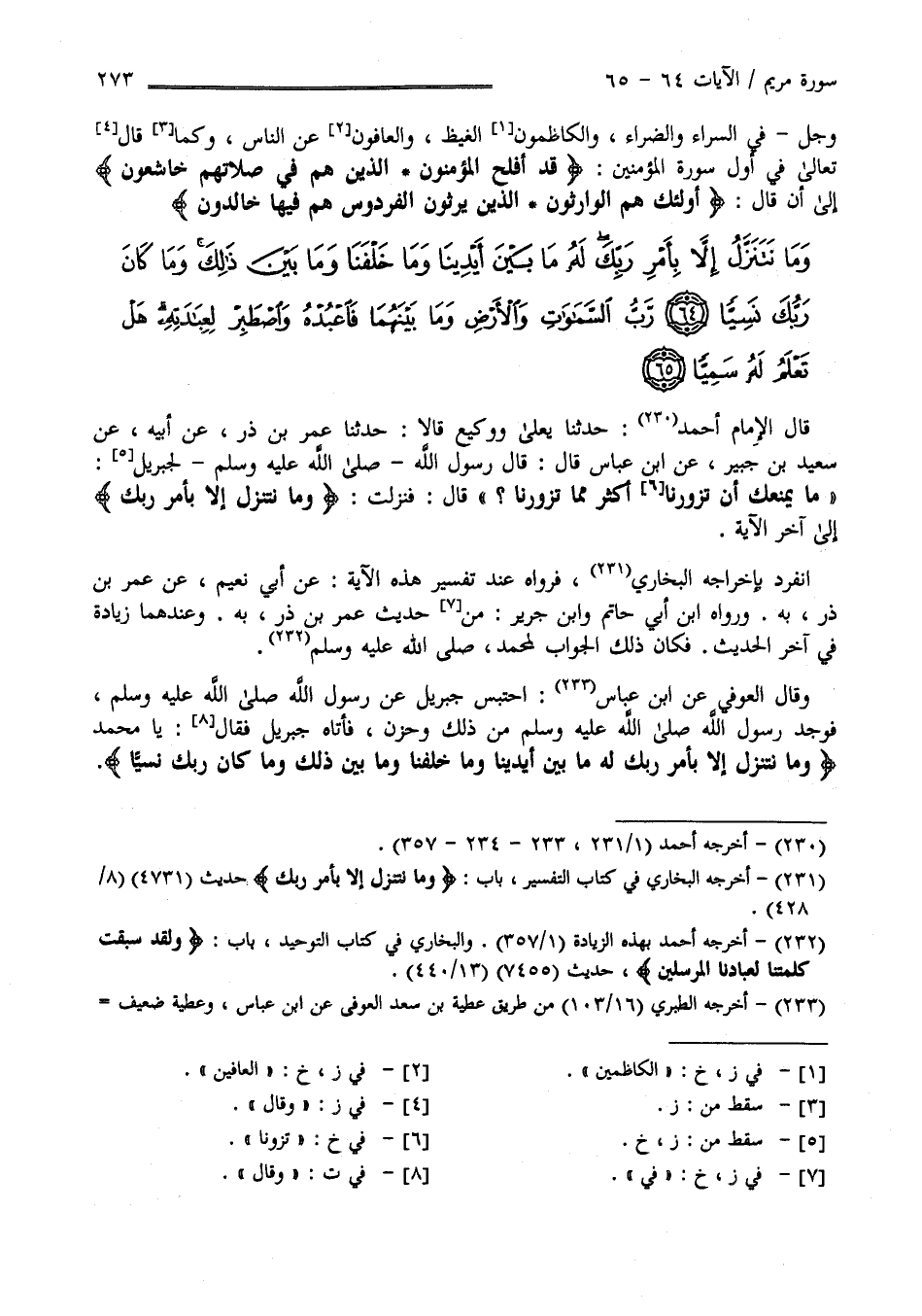 قَالَ الْإِمَام أَحْمَد : حَدَّثَنَا يَعْلَى وَوَكِيع قَالَا حَدَّثَنَا عُمَر بْن ذَرّ عَنْ أَبِيهِ عَنْ سَعِيد بْن جُبَيْر عَنْ اِبْن عَبَّاس قَالَ : قَالَ رَسُول اللَّه صَلَّى اللَّه عَلَيْهِ وَسَلَّمَ لِجَبْرَائِيل " مَا يَمْنَعك أَنْ تَزُورنَا أَكْثَر مِمَّا تَزُورنَا ؟ " قَالَ فَنَزَلَتْ " وَمَا نَتَنَزَّل إِلَّا بِأَمْرِ رَبّك " إِلَى آخِر الْآيَة .