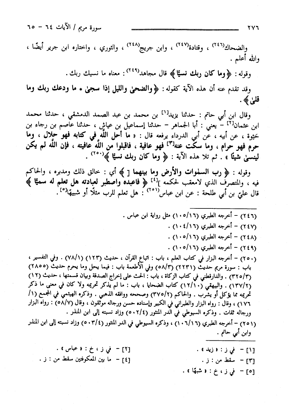 وَقَوْله " وَمَا كَانَ رَبّك نَسِيًّا " قَالَ مُجَاهِد وَالسُّدِّيّ : مَعْنَاهُ مَا نَسِيَك رَبّك وَقَدْ تَقَدَّمَ عَنْهُ أَنَّ هَذِهِ الْآيَة كَقَوْلِهِ " وَالضُّحَى وَاللَّيْل إِذَا سَجَّى مَا وَدَّعَك رَبّك وَمَا قَلَى " وَقَالَ اِبْن أَبِي حَاتِم حَدَّثَنَا يَزِيد بْن مُحَمَّد بْن عَبْد الصَّمَد الدِّمَشْقِيّ حَدَّثَنَا مُحَمَّد بْن عُثْمَان يَعْنِي أَبَا الْجُمَاهِر حَدَّثَنَا إِسْمَاعِيل بْن عَيَّاش حَدَّثَنَا عَاصِم بْن رَجَاء بْن حَيْوَة عَنْ أَبِيهِ عَنْ أَبِي الدَّرْدَاء يَرْفَعهُ قَالَ " مَا أَحَلَّ اللَّه فِي كِتَابه فَهُوَ حَلَال وَمَا حَرَّمَهُ فَهُوَ حَرَام وَمَا سَكَتَ عَنْهُ فَهُوَ عَافِيَة فَاقْبَلُوا مِنْ اللَّه عَافِيَته فَإِنَّ اللَّه لَمْ يَكُنْ لِيَنْسَى شَيْئًا " ثُمَّ تَلَا هَذِهِ الْآيَة " وَمَا كَانَ رَبّك نَسِيًّا " .
