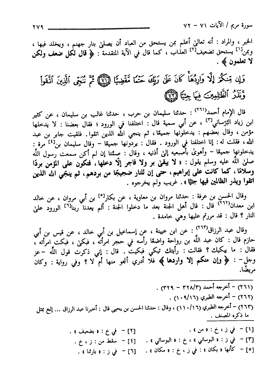 قَالَ الْإِمَام أَحْمَد حَدَّثَنَا سُلَيْمَان بْن حَرْب حَدَّثَنَا خَالِد بْن سُلَيْمَان عَنْ كَثِير بْن زِيَاد الْبُرْسَانِيّ عَنْ أَبِي سُمَيَّة قَالَ اِخْتَلَفْنَا فِي الْوُرُود فَقَالَ بَعْضنَا لَا يَدْخُلهَا مُؤْمِن وَقَالَ بَعْضهمْ يَدْخُلُونَهَا جَمِيعًا ثُمَّ يُنَجِّي اللَّه الَّذِينَ اِتَّقَوْا فَلَقِيت جَابِر بْن عَبْد اللَّه فَقُلْت لَهُ إِنَّا اِخْتَلَفْنَا فِي الْوُرُود فَقَالَ يَرِدُونَهَا جَمِيعًا وَقَالَ سُلَيْمَان بْن مُرَّة يَدْخُلُونَهَا جَمِيعًا وَأَهْوَى بِأُصْبُعَيْهِ إِلَى أُذُنَيْهِ وَقَالَ صَمْتًا إِنْ لَمْ أَكُنْ سَمِعْت رَسُول اللَّه صَلَّى اللَّه عَلَيْهِ وَسَلَّمَ يَقُول : " لَا يَبْقَى بَرّ وَلَا فَاجِر إِلَّا دَخَلَهَا فَتَكُون عَلَى الْمُؤْمِن بَرْدًا وَسَلَامًا كَمَا كَانَتْ عَلَى إِبْرَاهِيم حَتَّى إِنَّ لِلنَّارِ ضَجِيجًا مِنْ بَرْدهمْ ثُمَّ يُنَجِّي اللَّه الَّذِينَ اِتَّقَوْا وَيَذَر الظَّالِمِينَ فِيهَا جِثِيًّا " غَرِيب وَلَمْ يُخَرِّجُوهُ وَقَالَ الْحَسَن بْن عَرَفَة حَدَّثَنَا مَرْوَان بْن مُعَاوِيَة عَنْ بَكَّار بْن أَبِي مَرْوَان عَنْ خَالِد بْن مَعْدَان قَالَ : قَالَ أَهْل الْجَنَّة بَعْدَمَا دَخَلُوا الْجَنَّة أَلَمْ يَعِدنَا رَبّنَا الْوُرُود عَلَى النَّار ؟ قَالَ قَدْ مَرَرْتُمْ عَلَيْهَا وَهِيَ خَامِدَة وَقَالَ عَبْد الرَّزَّاق عَنْ اِبْن عُيَيْنَة عَنْ إِسْمَاعِيل بْن أَبِي خَالِد عَنْ قَيْس بْن أَبِي حَازِم قَالَ كَانَ عَبْد اللَّه بْن رَوَاحَة وَاضِعًا رَأْسه فِي حِجْر اِمْرَأَته فَبَكَى فَبَكَتْ اِمْرَأَته قَالَ مَا يُبْكِيك ؟ قَالَتْ رَأَيْتُك تَبْكِي فَبَكَيْت قَالَ إِنِّي ذَكَرْت قَوْل اللَّه عَزَّ وَجَلَّ " وَإِنْ مِنْكُمْ إِلَّا وَارِدهَا " فَلَا أَدْرِي أَنْجُو مِنْهَا أَمْ لَا - وَفِي رِوَايَة - وَكَانَ مَرِيضًا