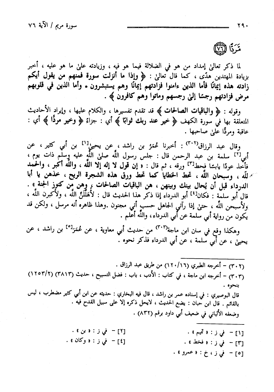 وَقَوْله : " وَالْبَاقِيَات الصَّالِحَات " قَدْ تَقَدَّمَ تَفْسِيرهَا وَالْكَلَام عَلَيْهَا وَإِيرَاد الْأَحَادِيث الْمُتَعَلِّقَة بِهَا فِي سُورَة الْكَهْف " خَيْر عِنْد رَبّك ثَوَابًا " أَيْ جَزَاء " وَخَيْر مَرَدًّا " أَيْ عَاقِبَة وَمَرَدًّا عَلَى صَاحِبهَا وَقَالَ عَبْد الرَّزَّاق أَخْبَرَنَا مَعْمَر بْن رَاشِد عَنْ يَحْيَى بْن أَبِي كَثِير عَنْ أَبِي سَلَمَة بْن عَبْد الرَّحْمَن قَالَ جَلَسَ رَسُول اللَّه صَلَّى اللَّه عَلَيْهِ وَسَلَّمَ ذَات يَوْم فَأَخَذَ عُودًا يَابِسًا فَحَطَّ وَرَقه ثُمَّ قَالَ : " إِنَّ قَوْل لَا إِلَه إِلَّا اللَّه وَاَللَّه أَكْبَر وَسُبْحَان اللَّه وَالْحَمْد لِلَّهِ تَحُطّ الْخَطَايَا كَمَا تَحُطّ وَرَق هَذِهِ الشَّجَرَة الرِّيح خُذْهُنَّ يَا أَبَا الدَّرْدَاء قَبْل أَنْ يُحَال بَيْنك وَبَيْنهنَّ هُنَّ الْبَاقِيَات الصَّالِحَات وَهُنَّ مِنْ كُنُوز الْجَنَّة " قَالَ أَبُو سَلَمَة فَكَانَ أَبُو الدَّرْدَاء إِذَا ذَكَرَ هَذَا الْحَدِيث قَالَ لَأُهْلِلَنَّ اللَّه وَلَأُكَبِّرَنَّ اللَّه وَلَأُسَبِّحَنَّ اللَّه حَتَّى إِذَا رَآنِي الْجَاهِل حَسِبَ أَنِّي مَجْنُون وَهَذَا ظَاهِره أَنَّهُ مُرْسَل وَلَكِنْ قَدْ يَكُون مِنْ رِوَايَة أَبِي سَلَمَة عَنْ أَبِي الدَّرْدَاء وَاَللَّه أَعْلَم .