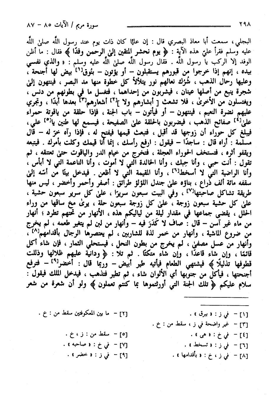 الْبَجَلِيّ سَمِعْت أَبَا مُعَاذ الْبَصْرِيّ قَالَ إِنَّ عَلِيًّا كَانَ ذَات يَوْم عِنْد رَسُول اللَّه صَلَّى اللَّه عَلَيْهِ وَسَلَّمَ فَقَرَأَ هَذِهِ الْآيَة " يَوْم نَحْشُر الْمُتَّقِينَ إِلَى الرَّحْمَن وَفْدًا " فَقَالَ مَا أَظُنّ الْوَفْد إِلَّا الرَّكْب يَا رَسُول اللَّه ؟ فَقَالَ النَّبِيّ صَلَّى اللَّه عَلَيْهِ وَسَلَّمَ " وَاَلَّذِي نَفْسِي بِيَدِهِ إِنَّهُمْ إِذَا خَرَجُوا مِنْ قُبُورهمْ يُسْتَقْبَلُونَ أَوْ يُؤْتَوْنَ بِنُوقٍ بِيض لَهَا أَجْنِحَة وَعَلَيْهَا رِحَال الذَّهَب شُرُك نِعَالهمْ نُور يَتَلَأْلَأ كُلّ خَطْوَة مِنْهَا مَدّ الْبَصَر فَيَنْتَهُونَ إِلَى شَجَرَة يَنْبُع مِنْ أَصْلهَا عَيْنَانِ فَيَشْرَبُونَ مِنْ إِحْدَاهُمَا فَتَغْسِل مَا فِي بُطُونهمْ مِنْ دَنَس وَيَغْتَسِلُونَ مِنْ الْأُخْرَى فَلَا تَشْعَث أَبْشَارهمْ وَلَا أَشْعَارهمْ بَعْدهَا أَبَدًا وَتَجْرِي عَلَيْهِمْ نَضْرَة النَّعِيم فَيَنْتَهُونَ أَوْ فَيَأْتُونَ بَاب الْجَنَّة فَإِذَا حَلْقَة مِنْ يَاقُوتَة حَمْرَاء عَلَى صَفَائِح الذَّهَب فَيَضْرِبُونَ بِالْحَلْقَةِ عَلَى الصَّفْحَة فَيُسْمَع لَهَا طَنِين - يَا عَلِيّ - فَيُبَلِّغ كُلّ حَوْرَاء أَنَّ زَوْجهَا قَدْ أَقْبَلَ فَتَبْعَث قَيِّمهَا فَيَفْتَح لَهُ فَإِذَا رَآهُ خَرَّ لَهُ - قَالَ مَسْلَمَة أَرَاهُ قَالَ سَاجِدًا - فَيَقُول اِرْفَعْ رَأْسك فَإِنَّمَا أَنَا قَيِّمك وُكِّلْت بِأَمْرِك فَيَتْبَعهُ وَيَقْفُو أَثَره فَتَسْتَخِفّ الْحَوْرَاء الْعَجِلَة فَتَخْرُج مِنْ خِيَام الدُّرّ وَالْيَاقُوت حَتَّى تَعْتَنِقهُ ثُمَّ تَقُول أَنْتَ حِبِّي وَأَنَا حِبّك وَأَنَا الْخَالِدَة الَّتِي لَا أَمُوت وَأَنَا النَّاعِمَة الَّتِي لَا أَبَأْس وَأَنَا الرَّاضِيَة الَّتِي لَا أَسْخَط وَأَنَا الْمُقِيمَة الَّتِي لَا أَظْعَن فَيَدْخُل بَيْتًا مِنْ أُسّه إِلَى سَقْفه مِائَة أَلْف ذِرَاع بِنَاؤُهُ عَلَى جَنْدَل اللُّؤْلُؤ طَرَائِق أَحْمَر وَأَصْفَر وَأَخْضَر لَيْسَ مِنْهَا طَرِيقَة تُشَاكِل صَاحِبَتهَا وَفِي الْبَيْت سَبْعُونَ سَرِيرًا عَلَى كُلّ سَرِير سَبْعُونَ حَشِيَّة عَلَى كُلّ حَشِيَّة سَبْعُونَ زَوْجَة عَلَى كُلّ زَوْجَة سَبْعُونَ حُلَّة يَرَى مُخّ سَاقهَا مِنْ وَرَاء الْحُلَل يَقْضِي جِمَاعهَا فِي مِقْدَار لَيْلَة مِنْ لَيَالِيكُمْ هَذِهِ الْأَنْهَار مِنْ تَحْتهمْ تَطَّرِد أَنْهَار مِنْ مَاء غَيْر آسِن قَالَ صَافٍ لَا كَدَر فِيهِ وَأَنْهَار مِنْ لَبَن لَمْ يَتَغَيَّر طَعْمه وَلَمْ يَخْرُج مِنْ ضُرُوع الْمَاشِيَة وَأَنْهَار مِنْ خَمْر لَذَّة لِلشَّارِبِينَ لَمْ يَعْتَصِرهَا الرِّجَال بِأَقْدَامِهِمْ وَأَنْهَار مِنْ عَسَل مُصَفًّى لَمْ يَخْرُج مِنْ بُطُون النَّحْل فَيَسْتَجْلِي الثِّمَار فَإِنْ شَاءَ أَكَلَ قَائِمًا وَإِنْ شَاءَ قَاعِدًا وَإِنْ شَاءَ مُتَّكِئًا ثُمَّ تَلَا " وَدَانِيَة عَلَيْهِمْ ظِلَالهَا وَذُلِّلَتْ قُطُوفهَا تَذْلِيلًا " فَيَشْتَهِي الطَّعَام فَيَأْتِيه طَيْر أَبْيَض وَرُبَّمَا قَالَ أَخْضَر فَتَرْفَع أَجْنِحَتهَا فَأَكَلَ مِنْ جُنُوبهَا أَيّ الْأَلْوَان شَاءَ ثُمَّ تَطِير فَتَذْهَب فَيَدْخُل الْمَلَك فَيَقُول سَلَام عَلَيْكُمْ " تِلْكَ الْجَنَّة الَّتِي أُورِثْتُمُوهَا بِمَا كُنْتُمْ تَعْمَلُونَ " وَلَوْ