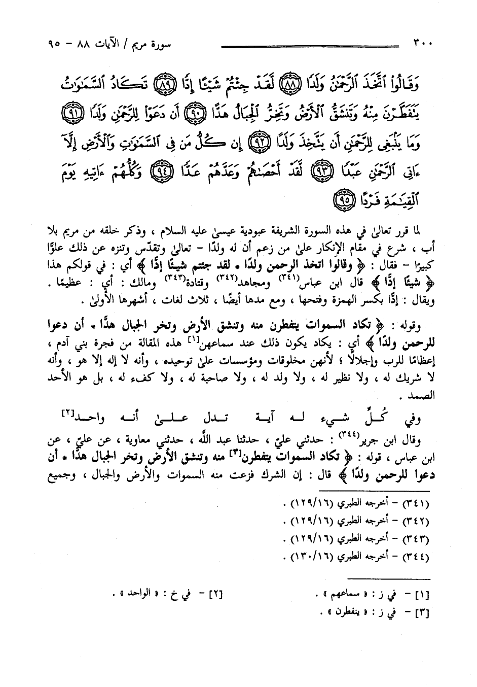 قَالَ اِبْن جَرِير : حَدَّثَنِي عَلِيّ حَدَّثَنَا عَبْد اللَّه حَدَّثَنِي مُعَاوِيَة عَنْ عَلِيّ عَنْ اِبْن عَبَّاس فِي قَوْله " تَكَاد السَّمَاوَات يَتَفَطَّرْنَ مِنْهُ وَتَنْشَقّ الْأَرْض وَتَخِرّ الْجِبَال هَدًّا أَنْ دَعَوْا لِلرَّحْمَنِ وَلَدًا " قَالَ إِنَّ الشِّرْك فَزِعَتْ مِنْهُ السَّمَاوَات وَالْأَرْض وَالْجِبَال وَجَمِيع