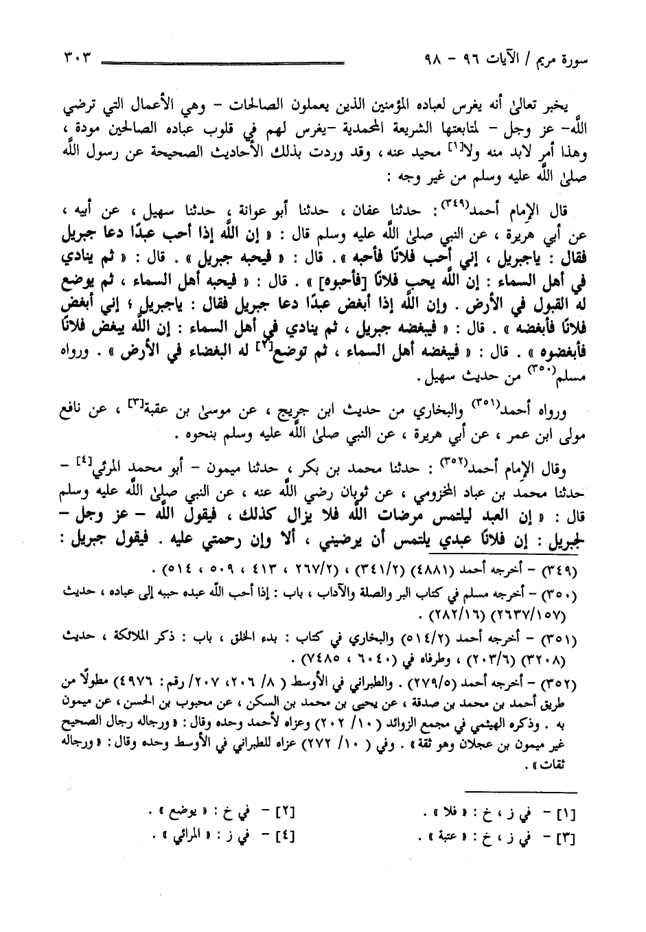 يُخْبِر تَعَالَى أَنَّهُ يَغْرِس لِعِبَادِهِ الْمُؤْمِنِينَ الَّذِينَ يَعْمَلُونَ الصَّالِحَات وَهِيَ الْأَعْمَال الَّتِي تُرْضِي اللَّه عَزَّ وَجَلَّ لِمُتَابَعَتِهَا الشَّرِيعَة الْمُحَمَّدِيَّة يَغْرِس لَهُمْ فِي قُلُوب عِبَاده الصَّالِحِينَ مَحَبَّة وَمَوَدَّة وَهَذَا أَمْر لَا بُدّ مِنْهُ وَلَا مَحِيد عَنْهُ وَقَدْ وَرَدَتْ بِذَلِكَ الْأَحَادِيث الصَّحِيحَة عَنْ رَسُول اللَّه صَلَّى اللَّه عَلَيْهِ وَسَلَّمَ مِنْ غَيْر وَجْه قَالَ الْإِمَام أَحْمَد : حَدَّثَنَا عَفَّان حَدَّثَنَا أَبُو عَوَانَة حَدَّثَنَا سُهَيْل عَنْ أَبِيهِ عَنْ أَبِي هُرَيْرَة عَنْ النَّبِيّ صَلَّى اللَّه عَلَيْهِ وَسَلَّمَ قَالَ : " إِنَّ اللَّه إِذَا أَحَبَّ عَبْدًا دَعَا جِبْرِيل فَقَالَ يَا جِبْرِيل إِنِّي أُحِبّ فُلَانًا فَأَحِبَّهُ قَالَ فَيُحِبّهُ جِبْرِيل قَالَ ثُمَّ يُنَادِي فِي أَهْل السَّمَاء إِنَّ اللَّه يُحِبّ فُلَانًا فَأَحِبُّوهُ قَالَ فَيُحِبّهُ أَهْل السَّمَاء ثُمَّ يُوضَع لَهُ الْقَبُول فِي الْأَرْض وَإِنَّ اللَّه إِذَا أَبْغَضَ عَبْدًا دَعَا جِبْرِيل فَقَالَ يَا جِبْرِيل إِنِّي أُبْغِض فُلَانًا فَأَبْغِضْهُ قَالَ فَيُبْغِضهُ جِبْرِيل ثُمَّ يُنَادِي فِي أَهْل السَّمَاء إِنَّ اللَّه يُبْغِض فُلَانًا فَأَبْغِضُوهُ قَالَ فَيُبْغِضهُ أَهْل السَّمَاء ثُمَّ يُوضَع لَهُ الْبَغْضَاء فِي الْأَرْض " وَرَوَاهُ مُسْلِم مِنْ حَدِيث سُهَيْل وَرَوَاهُ أَحْمَد وَالْبُخَارِيّ مِنْ حَدِيث اِبْن جُرَيْج عَنْ مُوسَى بْن عُتْبَة عَنْ نَافِع مَوْلَى اِبْن عُمَر عَنْ أَبِي هُرَيْرَة رَضِيَ اللَّه عَنْهُ عَنْ النَّبِيّ صَلَّى اللَّه عَلَيْهِ وَسَلَّمَ نَحْوه وَقَالَ الْإِمَام أَحْمَد : حَدَّثَنَا مُحَمَّد بْن بَكْر حَدَّثَنَا مَيْمُون أَبُو مُحَمَّد الْمُرَائِيّ حَدَّثَنَا مُحَمَّد بْن عَبَّاد الْمَخْزُومِيّ عَنْ ثَوْبَان رَضِيَ اللَّه عَنْهُ عَنْ النَّبِيّ صَلَّى اللَّه عَلَيْهِ وَسَلَّمَ قَالَ : " إِنَّ الْعَبْد لَيَلْتَمِس مَرْضَاة اللَّه عَزَّ وَجَلَّ فَلَا يَزَال كَذَلِكَ فَيَقُول اللَّه عَزَّ وَجَلَّ لِجِبْرِيل إِنَّ فُلَانًا عَبْدِي يَلْتَمِس أَنْ يُرْضِينِي أَلَا وَإِنَّ رَحْمَتِي عَلَيْهِ فَيَقُول جِبْرِيل :