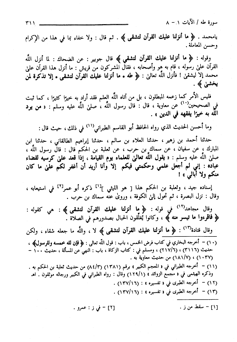 قَوْله " مَا أَنْزَلْنَا عَلَيْك الْقُرْآن لِتَشْقَى " قَالَ جُوَيْبِر عَنْ الضَّحَّاك لَمَّا أَنْزَلَ اللَّه الْقُرْآن عَلَى رَسُوله صَلَّى اللَّه عَلَيْهِ وَسَلَّمَ قَامَ بِهِ هُوَ وَأَصْحَابه فَقَالَ الْمُشْرِكُونَ مِنْ قُرَيْش مَا أُنْزِلَ هَذَا الْقُرْآن عَلَى مُحَمَّد إِلَّا لِيَشْقَى فَأَنْزَلَ اللَّه تَعَالَى " طه مَا أَنْزَلْنَا عَلَيْك الْقُرْآن لِتَشْقَى إِلَّا تَذْكِرَة لِمَنْ يَخْشَى " فَلَيْسَ الْأَمْر كَمَا زَعَمَهُ الْمُبْطِلُونَ بَلْ مَنْ آتَاهُ اللَّه الْعِلْم فَقَدْ أَرَادَ بِهِ خَيْرًا كَثِيرًا كَمَا ثَبَتَ فِي الصَّحِيحَيْنِ عَنْ مُعَاوِيَة قَالَ : قَالَ رَسُول اللَّه صَلَّى اللَّه عَلَيْهِ وَسَلَّمَ " مَنْ يُرِدْ اللَّه بِهِ خَيْرًا يُفَقِّههُ فِي الدِّين " وَمَا أَحْسَن الْحَدِيث الَّذِي رَوَاهُ الْحَافِظ أَبُو الْقَاسِم الطَّبَرَانِيّ فِي ذَلِكَ حَيْثُ قَالَ حَدَّثَنَا أَحْمَد بْن زُهَيْر حَدَّثَنَا الْعَلَاء بْن سَالِم حَدَّثَنَا إِبْرَاهِيم الطَّالْقَانِىّ حَدَّثَنَا اِبْن الْمُبَارَك عَنْ سُفْيَان عَنْ سِمَاك بْن حَرْب عَنْ ثَعْلَبَة بْن الْحَكَم قَالَ : قَالَ رَسُول اللَّه صَلَّى اللَّه عَلَيْهِ وَسَلَّمَ " يَقُول اللَّه تَعَالَى لِلْعُلَمَاءِ يَوْم الْقِيَامَة إِذَا قَعَدَ عَلَى كُرْسِيّه لِقَضَاءِ عِبَاده إِنِّي لَمْ أَجْعَل عِلْمِي وَحِكْمَتِي فِيكُمْ إِلَّا وَأَنَا أُرِيد أَنْ أَغْفِر لَكُمْ عَلَى مَا كَانَ مِنْكُمْ وَلَا أُبَالِي " إِسْنَاده جَيِّد وَثَعْلَبَة بْن الْحَكَم هَذَا هُوَ اللَّيْثِيّ ذَكَرَهُ أَبُو عُمَر فِي اِسْتِيعَابه وَقَالَ نَزَلَ الْبَصْرَة ثُمَّ تَحَوَّلَ إِلَى الْكُوفَة وَرَوَى عَنْهُ سِمَاك بْن حَرْب وَقَالَ مُجَاهِد فِي قَوْله " مَا أَنْزَلْنَا عَلَيْك الْقُرْآن لِتَشْقَى " هِيَ كَقَوْلِهِ " فَاقْرَءُوا مَا تَيَسَّرَ مِنْهُ " وَكَانُوا يُعَلِّقُونَ الْحِبَال بِصُدُورِهِمْ فِي الصَّلَاة وَقَالَ قَتَادَة " مَا أَنْزَلْنَا عَلَيْك الْقُرْآن لِتَشْقَى " لَا وَاَللَّه مَا جَعَلَهُ شَقَاء وَلَكِنْ