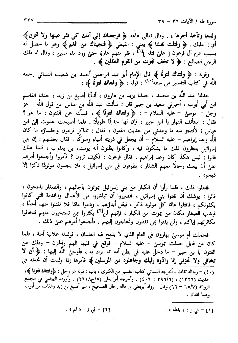 وَلَدهَا وَتَأْخُذ أَجْرهَا " وَقَالَ تَعَالَى هَاهُنَا فَرَجَعْنَاك إِلَى أُمّك كَيْ تَقَرّ عَيْنهَا وَلَا تَحْزَن أَيْ عَلَيْك وَقَتَلْت نَفْسًا يَعْنِي الْقِبْطِيّ فَنَجَّيْنَاك مِنْ الْغَمّ وَهُوَ مَا حَصَلَ لَهُ بِسَبَبِ عَزْم آلِ فِرْعَوْن عَلَى قَتْله فَفَرَّ مِنْهُمْ هَارِبًا حَتَّى وَرَدَ مَاء مَدْيَن وَقَالَ لَهُ ذَلِكَ الرَّجُل الصَّالِح لَا تَخَفْ نَجَوْت مِنْ الْقَوْم الظَّالِمِينَ وَقَوْله وَفَتَنَّاك فُتُونًا قَالَ الْإِمَام أَبُو عَبْد الرَّحْمَن أَحْمَد بْن شُعَيْب النَّسَائِيّ رَحِمَهُ اللَّه فِي كِتَاب التَّفْسِير مِنْ سُنَنه قَوْله وَفَتَنَّاك فُتُونًا " حَدِيث الْفُتُون " حَدَّثَنَا عَبْد اللَّه بْن مُحَمَّد حَدَّثَنَا يَزِيد بْن هَارُون أَنْبَأَنَا أَصْبَغ بْن زَيْد حَدَّثَنَا الْقَاسِم بْن أَبِي أَيُّوب أَخْبَرَنِي سَعِيد بْن جُبَيْر قَالَ : سَأَلْت عَبْد اللَّه بْن عَبَّاس عَنْ قَوْل اللَّه عَزَّ وَجَلَّ لِمُوسَى عَلَيْهِ السَّلَام " وَفَتَنَّاك فُتُونًا " فَسَأَلْته عَنْ الْفُتُون مَا هُوَ فَقَالَ اِسْتَأْنِفْ النَّهَار يَا اِبْن جُبَيْر فَإِنَّ لَهَا حَدِيثًا طَوِيلًا فَلَمَّا أَصْبَحْت غَدَوْت إِلَى اِبْن عَبَّاس لِأَنْتَجِزَ مِنْهُ مَا وَعَدَنِي مِنْ حَدِيث الْفُتُون فَقَالَ تَذَاكَرَ فِرْعَوْن وَجُلَسَاؤُهُ مَا كَانَ اللَّه وَعَدَ إِبْرَاهِيم عَلَيْهِ السَّلَام أَنْ يَجْعَل فِي ذِمَّته أَبْنَاء وَمُلُوكًا فَقَالَ بَعْضهمْ إِنَّ بَنِي إِسْرَائِيل يَنْتَظِرُونَ ذَلِكَ لَا يَشُكُّونَ فِيهِ وَكَانُوا يَظُنُّونَ أَنَّهُ يُوسُف بْن يَعْقُوب فَلَمَّا هَلَكَ قَالُوا لَيْسَ هَكَذَا كَانَ وَعْد إِبْرَاهِيم فَقَالَ فِرْعَوْن كَيْف تَرَوْنَ فَائْتَمَرُوا وَأَجْمَعُوا أَمْرهمْ عَلَى أَنْ يَبْعَث رِجَالًا مَعَهُمْ الشِّفَار يَطُوفُونَ فِي بَنِي إِسْرَائِيل فَلَا يَجِدُونَ مَوْلُودًا ذَكَرًا إِلَّا ذَبَحُوهُ فَفَعَلُوا ذَلِكَ فَلَمَّا رَأَوْا أَنَّ الْكِبَار مِنْ بَنِي إِسْرَائِيل يَمُوتُونَ بِآجَالِهِمْ وَالصِّغَار يُذْبَحُونَ قَالُوا لَيُوشَكَنَّ أَنْ تُفْنُوا بَنِي إِسْرَائِيل فَتَصِيرُوا إِلَى أَنْ تُبَاشِرُوا مِنْ الْأَعْمَال وَالْخِدْمَة الَّتِي يَكْفُونَكُمْ فَاقْتُلُوا عَامًا كُلّ مَوْلُود ذَكَرًا وَاتْرُكُوا بَنَاتهمْ وَدَعُوا عَامًا فَلَا تَقْتُلُوا مِنْهُمْ أَحَدًا فَيَشِبّ الصِّغَار مَكَان مَنْ يَمُوت مِنْ الْكِبَار فَإِنَّهُمْ لَنْ يَكْثُرُوا بِمَنْ تَسْتَحْيُونَ مِنْهُمْ فَتَخَافُوا مُكَاثَرَتهمْ