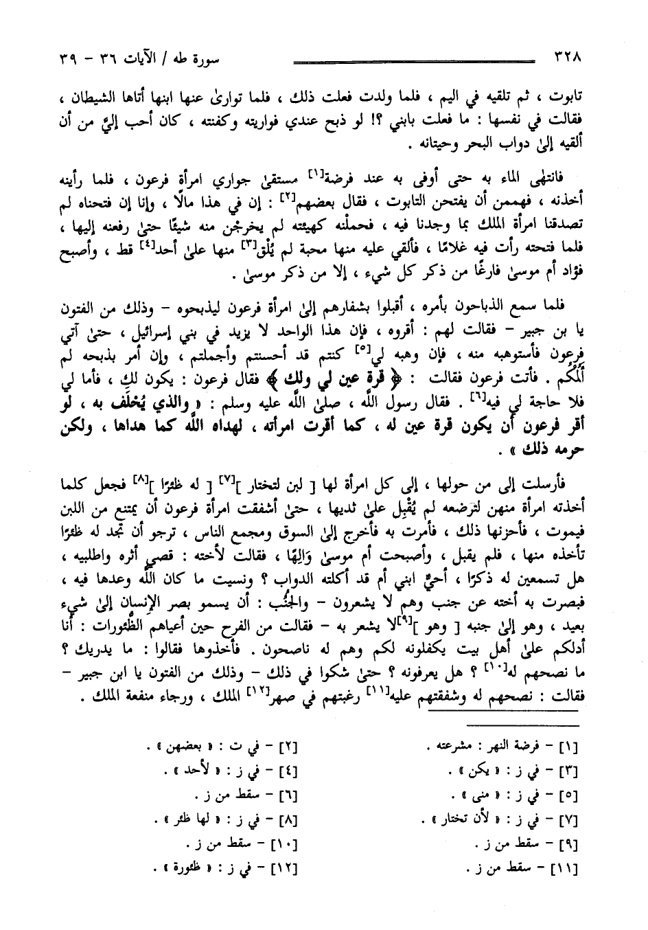 تَابُوت ثُمَّ تُلْقِيه فِي الْيَمّ فَلَمَّا وَلَدَتْ فَعَلَتْ ذَلِكَ فَلَمَّا تَوَارَى عَنْهَا اِبْنهَا أَتَاهَا الشَّيْطَان فَقَالَتْ فِي نَفْسهَا مَا فَعَلْت بِابْنِي لَوْ ذُبِحَ عِنْدِي فَوَارَيْته وَكَفَّنْته كَانَ أَحَبّ إِلَيَّ مِنْ أَنْ أُلْقِيه إِلَى دَوَابّ الْبَحْر وَحِيتَانه فَانْتَهَى الْمَاء بِهِ حَتَّى أَوْفَى بِهِ عِنْد فُرْضَة مُسْتَقَى جِوَارِي اِمْرَأَة فِرْعَوْن فَلَمَّا رَأَيْنَهُ أَخَذْنَهُ فَأَرَدْنَ أَنْ يَفْتَحْنَ التَّابُوت فَقَالَ بَعْضهنَّ إِنَّ فِي هَذَا مَالًا وَإِنَّا إِنْ فَتَحْنَاهُ لَمْ تُصَدِّقنَا اِمْرَأَة الْمَلِك بِمَا وَجَدْنَا فِيهِ فَحَمَلْنَهُ كَهَيْئَتِهِ لَمْ يُخْرِجْنَ مِنْهُ شَيْئًا حَتَّى دَفَعْنَهُ إِلَيْهَا فَلَمَّا فَتَحَتْهُ رَأَتْ فِيهِ غُلَامًا فَأَلْقَى اللَّه عَلَيْهِ مِنْهَا مَحَبَّة لَمْ يُلْقِ مِنْهَا عَلَى أَحَد قَطُّ وَأَصْبَحَ فُؤَاد أُمّ مُوسَى فَارِغًا مِنْ ذِكْر كُلّ شَيْء إِلَّا مِنْ ذِكْر مُوسَى فَلَمَّا سَمِعَ الذَّبَّاحُونَ بِأَمْرِهِ أَقْبَلُوا بِشِفَارِهِمْ إِلَى اِمْرَأَة فِرْعَوْن لِيَذْبَحُوهُ وَذَلِكَ مِنْ الْفُتُون يَا اِبْن جُبَيْر فَقَالَتْ لَهُمْ أَقِرُّوهُ فَإِنَّ هَذَا الْوَاحِد لَا يَزِيد فِي بَنِي إِسْرَائِيل حَتَّى آتِي فِرْعَوْن فَأَسْتَوْهِبهُ مِنْهُ فَإِنْ وَهَبَهُ لِي كُنْتُمْ قَدْ أَحْسَنْتُمْ وَأَجْمَلْتُمْ وَإِنْ أَمَرَ بِذَبْحِهِ لَمْ أَلُمْكُمْ فَأَتَتْ فِرْعَوْن فَقَالَتْ قُرَّة عَيْن لِي وَلَك فَقَالَ فِرْعَوْن يَكُون لَك فَأَمَّا لِي فَلَا حَاجَة لِي فِيهِ فَقَالَ رَسُول اللَّه صَلَّى اللَّه عَلَيْهِ وَسَلَّمَ " وَاَلَّذِي يُحْلَف بِهِ لَوْ أَقَرَّ فِرْعَوْن أَنْ يَكُون قُرَّة عَيْن لَهُ كَمَا أَقَرَّتْ اِمْرَأَته لَهَدَاهُ اللَّه كَمَا هَدَاهَا وَلَكِنْ حَرَمَهُ ذَلِكَ " فَأَرْسَلَتْ إِلَى مَنْ حَوْلهَا إِلَى كُلّ اِمْرَأَة لَهَا لِأَنْ تَخْتَار لَهُ ظِئْرًا فَجَعَلَ كُلَّمَا أَخَذَتْهُ اِمْرَأَة مِنْهُنَّ لِتُرْضِعهُ لَمْ يُقْبِل عَلَى ثَدْيهَا حَتَّى أَشْفَقَتْ اِمْرَأَة فِرْعَوْن أَنْ يَمْتَنِع مِنْ اللَّبَن فَيَمُوت فَأَحْزَنَهَا ذَلِكَ فَأَمَرَتْ بِهِ فَأُخْرِجَ إِلَى السُّوق وَمَجْمَع النَّاس تَرْجُو أَنْ تَجِد لَهُ ظِئْرًا تَأْخُذهُ مِنْهَا فَلَمْ يَقْبَل وَأَصْبَحَتْ أُمّ مُوسَى وَالِهًا فَقَالَتْ لِأُخْتِهِ قُصِّي أَثَره وَاطْلُبِيهِ هَلْ تَسْمَعِينَ لَهُ ذِكْرًا أَحَيّ اِبْنِي أَمْ قَدْ أَكَلَتْهُ الدَّوَابّ وَنَسِيَتْ مَا كَانَ اللَّه وَعَدَهَا فِيهِ فَبَصُرَتْ بِهِ أُخْته عَنْ جُنُب وَهُمْ لَا يَشْعُرُونَ وَالْجُنُب أَنْ يَسْمُو بَصَر الْإِنْسَان إِلَى شَيْء بَعِيد وَهُوَ إِلَى جَنْبه وَهُوَ لَا يَشْعُر بِهِ فَقَالَتْ مِنْ الْفَرَح حِين أَعْيَاهُمْ
