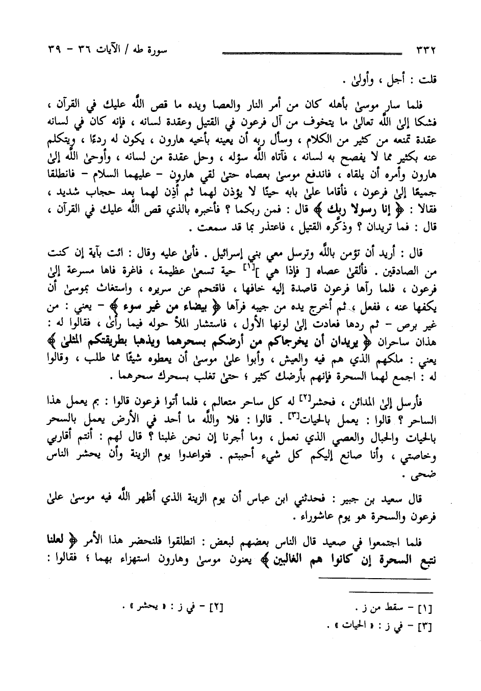 وَأَوْلَى فَلَمَّا سَارَ مُوسَى بِأَهْلِهِ كَانَ مِنْ أَمْر النَّار وَالْعَصَا وَيَده مَا قَصَّ اللَّه عَلَيْك فِي الْقُرْآن فَشَكَا إِلَى اللَّه تَعَالَى مَا يَحْذَر مِنْ آلِ فِرْعَوْن فِي الْقَتِيل وَعُقْدَة لِسَانه فَإِنَّهُ كَانَ فِي لِسَانه عُقْدَة تَمْنَعهُ مِنْ كَثِير مِنْ الْكَلَام وَسَأَلَ رَبّه أَنْ يُعِينهُ بِأَخِيهِ هَارُون يَكُون لَهُ رِدْءًا وَيَتَكَلَّم عَنْهُ بِكَثِيرٍ مِمَّا لَا يُفْصِح بِهِ لِسَانه فَآتَاهُ اللَّه سُؤْله وَحَلَّ عُقْدَة مِنْ لِسَانه وَأَوْحَى اللَّه إِلَى هَارُون وَأَمَرَهُ أَنْ يَلْقَاهُ فَانْدَفَعَ مُوسَى بِعَصَاهُ حَتَّى لَقِيَ هَارُون فَانْطَلَقَا جَمِيعًا إِلَى فِرْعَوْن فَأَقَامَا عَلَى بَابه حِينًا لَا يُؤْذَن لَهُمَا ثُمَّ أَذِنَ لَهُمَا بَعْد حِجَاب شَدِيد فَقَالَا إِنَّا رَسُولَا رَبّك قَالَ فَمَنْ رَبّكُمَا ؟ فَأَخْبَرَاهُ بِاَلَّذِي قَصَّ اللَّه عَلَيْك فِي الْقُرْآن قَالَ فَمَا تُرِيدَانِ ؟ وَذَكَّرَهُ الْقَتِيل فَاعْتَذَرَ بِمَا قَدْ سَمِعْت قَالَ أُرِيد أَنْ تُؤْمِن بِاَللَّهِ وَتُرْسِل مَعَنَا بَنَى إِسْرَائِيل فَأَبَى عَلَيْهِ وَقَالَ اِئْتِ بِآيَةٍ إِنْ كُنْت مِنْ الصَّادِقِينَ فَأَلْقَى عَصَاهُ فَإِذَا هِيَ حَيَّة تَسْعَى عَظِيمَة فَاغِرَة فَاهَا مُسْرِعَة إِلَى فِرْعَوْن فَلَمَّا رَآهَا فِرْعَوْن قَاعِدَة إِلَيْهِ خَافَهَا فَاقْتَحَمَ عَنْ سَرِيره وَاسْتَغَاثَ بِمُوسَى أَنْ يَكُفّهَا عَنْهُ فَفَعَلَ ثُمَّ أَخْرَجَ يَده مِنْ جَيْبه فَرَآهَا بَيْضَاء مِنْ غَيْر سُوء يَعْنِي مِنْ غَيْر بَرَص ثُمَّ رَدَّهَا فَعَادَتْ إِلَى لَوْنهَا الْأَوَّل فَاسْتَشَارَ الْمَلَأ حَوْله فِيمَا رَأَى فَقَالُوا لَهُ هَذَانِ سَاحِرَانِ يُرِيدَانِ أَنْ يُخْرِجَاكُمَا مِنْ أَرْضكُمْ بِسِحْرِهِمَا وَيَذْهَبَا بِطَرِيقَتِكُمْ الْمُثْلَى يَعْنِي مُلْكهمْ الَّذِي هُمْ فِيهِ وَالْعَيْش وَأَبَوْا عَلَى مُوسَى أَنْ يُعْطُوهُ شَيْئًا مِمَّا طَلَبَ وَقَالُوا لَهُ اِجْمَعْ لَهُمَا السَّحَرَة فَإِنَّهُمْ بِأَرْضِك كَثِير حَتَّى تَغْلِب بِسِحْرِك سِحْرهمَا فَأَرْسَلَ إِلَى الْمَدَائِن فَحُشِرَ لَهُ كُلّ سَاحِر مُتَعَالِم فَلَمَّا أَتَوْا فِرْعَوْن قَالُوا بِمَا يَعْمَل هَذَا السَّاحِر ؟ قَالُوا يَعْمَل بِالْحَيَّاتِ قَالُوا فَلَا وَاَللَّه مَا أَحَد فِي الْأَرْض يَعْمَل بِالسِّحْرِ بِالْحَيَّاتِ وَالْحِبَال وَالْعِصِيّ الَّذِي نَعْمَل فَمَا أَجْرنَا إِنْ نَحْنُ غَلَبْنَا ؟ قَالَ لَهُمْ أَنْتُمْ أَقَارِبِي وَخَاصَّتِي وَأَنَا صَانِع إِلَيْكُمْ كُلّ شَيْء أَحْبَبْتُمْ فَتَوَاعَدُوا يَوْم الزِّينَة وَأَنْ يُحْشَر النَّاس ضُحًى قَالَ سَعِيد بْن جُبَيْر فَحَدَّثَنِي اِبْن عَبَّاس أَنَّ يَوْم الزِّينَة الْيَوْم الَّذِي أَظْهَرَ اللَّه فِيهِ مُوسَى عَلَى فِرْعَوْن وَالسَّحَرَة هُوَ يَوْم عَاشُورَاء فَلَمَّا اِجْتَمَعُوا فِي صَعِيد وَاحِد قَالَ النَّاس بَعْضهمْ لِبَعْضٍ اِنْطَلَقُوا فَلْنَحْضُرْ هَذَا الْأَمْر لَعَلَّنَا نَتَّبِع السَّحَرَة إِنْ كَانُوا هُمْ الْغَالِبِينَ يَعْنُونَ مُوسَى وَهَارُون اِسْتِهْزَاء بِهِمَا فَقَالُوا