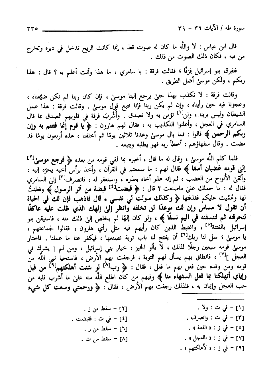 هَارُون يَا قَوْمِ إِنَّمَا فُتِنْتُمْ بِهِ وَإِنَّ رَبّكُمْ الرَّحْمَن فَاتَّبِعُونِي وَأَطِيعُوا أَمْرِي قَالُوا فَمَا بَال مُوسَى وَعَدَنَا ثَلَاثِينَ يَوْمًا ثُمَّ أَخْلَفْنَا هَذِهِ أَرْبَعُونَ يَوْمًا قَدْ مَضَتْ وَقَالَ سُفَهَاؤُهُمْ أَخْطَأَ رَبّه فَهُوَ يَطْلُبهُ يَتْبَعهُ فَلَمَّا كَلَّمَ اللَّه مُوسَى وَقَالَ لَهُ مَا قَالَ أَخْبَرَهُ بِمَا لَقِيَ قَوْمه مِنْ بَعْده فَرَجَعَ مُوسَى إِلَى قَوْمه غَضْبَان أَسِفًا فَقَالَ لَهُمْ مَا سَمِعْتُمْ فِي الْقُرْآن وَأَخَذَ بِرَأْسِ أَخِيهِ يَجُرّهُ إِلَيْهِ وَأَلْقَى الْأَلْوَاح مِنْ الْغَضَب ثُمَّ إِنَّهُ عَذَرَ أَخَاهُ بِعُذْرِهِ وَاسْتَغْفَرَ لَهُ وَانْصَرَفَ إِلَى السَّامِرِيّ فَقَالَ لَهُ مَا حَمَلَك عَلَى مَا صَنَعْت ؟ قَالَ قَبَضْت قَبْضَة مِنْ أَثَر الرَّسُول وَفَطِنْت لَهَا وَعَمِيَتْ عَلَيْكُمْ فَنَبَذْتهَا وَكَذَلِكَ سَوَّلَتْ لِي نَفْسِي قَالَ فَاذْهَبْ فَإِنَّ لَك فِي الْحَيَاة أَنْ تَقُول لَا مِسَاس وَإِنَّ لَك مَوْعِدًا لَنْ تُخْلَفَهُ وَانْظُرْ إِلَى إِلَهك الَّذِي ظَلْت عَلَيْهِ عَاكِفًا لَنُحَرِّقَنَّهُ ثُمَّ لَنَنْسِفَنَّهُ فِي الْيَمّ نَسْفًا وَلَوْ كَانَ إِلَهًا لَمْ يَخْلُص إِلَى ذَلِكَ مِنْهُ فَاسْتَيْقَنَ بَنُو إِسْرَائِيل بِالْفِتْنَةِ وَاغْتَبَطَ الَّذِينَ كَانَ رَأْيهمْ فِيهِ مِثْل رَأْي هَارُون فَقَالُوا لِجَمَاعَتِهِمْ يَا مُوسَى سَلْ لَنَا رَبّك أَنْ يَفْتَح لَنَا بَاب تَوْبَة نَصْنَعهَا فَيُكَفِّر عَنَّا مَا عَمِلْنَا فَاخْتَارَ مُوسَى قَوْمه سَبْعِينَ رَجُلًا لِذَلِكَ لَا يَأْلُو الْخَيْر خِيَار بَنِي إِسْرَائِيل وَمَنْ لَمْ يُشْرِك فِي الْعِجْل فَانْطَلَقَ بِهِمْ يَسْأَل لَهُمْ التَّوْبَة فَرَجَفَتْ بِهِمْ الْأَرْض فَاسْتَحْيَا نَبِيّ اللَّه مِنْ قَوْمه وَمِنْ وَفْده حِين فَعَلَ بِهِمْ مَا فَعَلَ فَقَالَ رَبّ لَوْ شِئْت أَهْلَكْتهمْ مِنْ قَبْل وَإِيَّايَ أَتُهْلِكُنَا بِمَا فَعَلَ السُّفَهَاء مِنَّا وَفِيهِمْ مَنْ كَانَ اللَّه اِطَّلَعَ مِنْهُ عَلَى مَا أُشْرِبَ قَلْبه مِنْ حُبّ الْعِجْل وَإِيمَانه بِهِ فَلِذَلِكَ رَجَفَتْ بِهِمْ الْأَرْض فَقَالَ وَرَحْمَتِي وَسِعَتْ كُلّ شَيْء