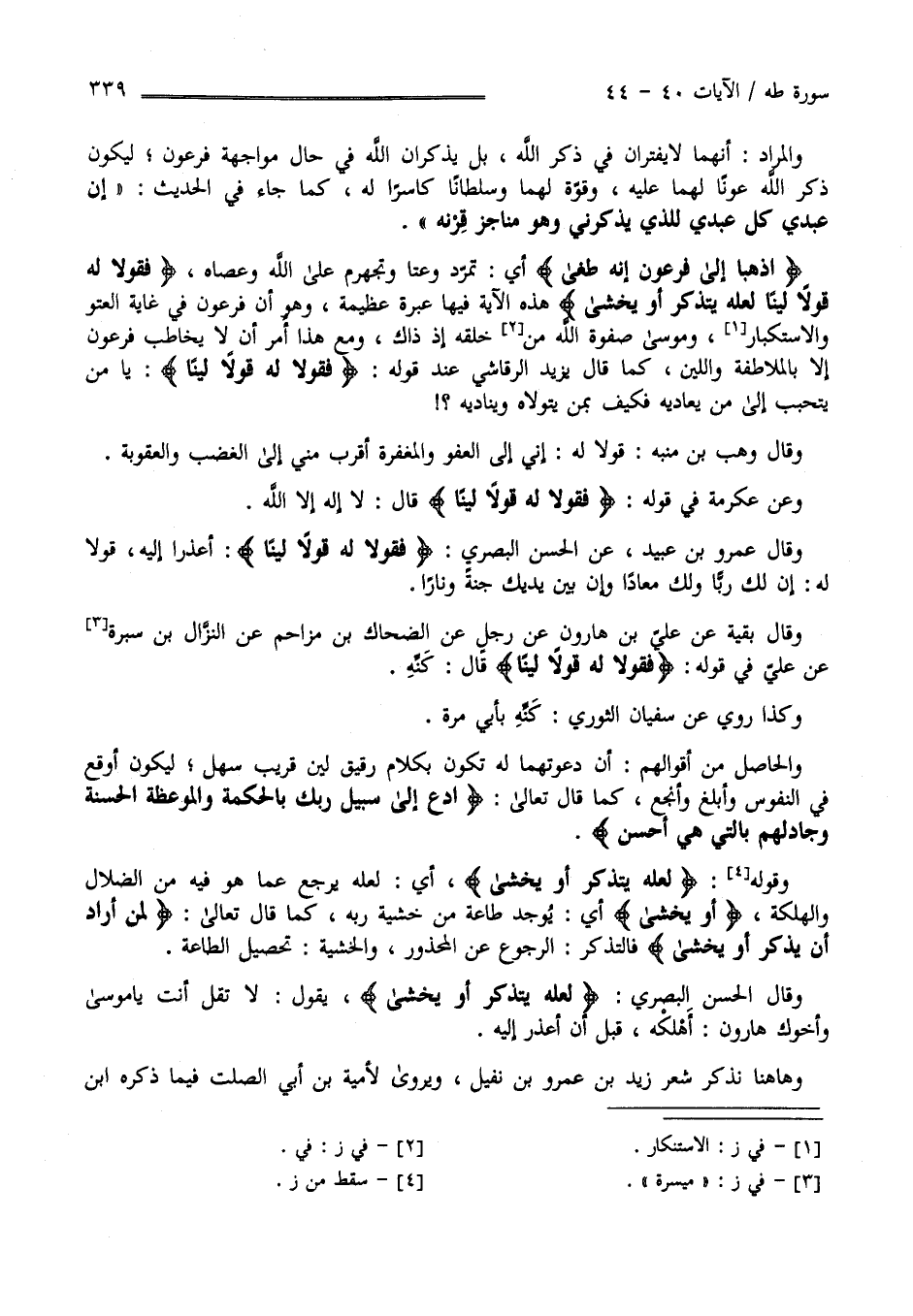وَقَالَ وَهْب بْن مُنَبِّه قُولَا لَهُ إِنِّي إِلَى الْعَفْو وَالْمَغْفِرَة أَقْرَب مِنِّي إِلَى الْغَضَب وَالْعُقُوبَة وَعَنْ عِكْرِمَة فِي قَوْله " فَقُولَا لَهُ قَوْلًا لَيِّنًا " قَالَ لَا إِلَه إِلَّا اللَّه وَقَالَ عَمْرو بْن عُبَيْد عَنْ الْحَسَن الْبَصْرِيّ " فَقُولَا لَهُ قَوْلًا لَيِّنًا " أَعْذِرَا إِلَيْهِ قُولَا لَهُ إِنَّ لَك رَبًّا وَلَك مَعَادًا لِأَنَّ بَيْن يَدَيْك جَنَّة وَنَارًا ; وَقَالَ بَقِيَّة عَنْ عَلِيّ بْن هَارُون عَنْ رَجُل عَنْ الضَّحَّاك بْن مُزَاحِم عَنْ النَّزَّال بْن سَبْرَة عَنْ عَلِيّ فِي قَوْله " فَقُولَا لَهُ قَوْلًا لَيِّنًا " قَالَ كَنِّهِ وَكَذَا رُوِيَ عَنْ سُفْيَان الثَّوْرِيّ كَنِّهِ بِأَبِي مَرَّة وَالْحَاصِل مِنْ أَقْوَالهمْ أَنَّ دَعْوَتهمَا لَهُ تَكُون بِكَلَامٍ رَقِيق لَيِّن سَهْل رَفِيق لِيَكُونَ أَوْقَع فِي النُّفُوس وَأَبْلَغ وَأَنْجَع كَمَا قَالَ تَعَالَى " اُدْعُ إِلَى سَبِيل رَبّك بِالْحِكْمَةِ وَالْمَوْعِظَة الْحَسَنَة وَجَادِلْهُمْ بِاَلَّتِي هِيَ أَحْسَن " وَقَوْله " لَعَلَّهُ يَتَذَكَّر أَوْ يَخْشَى " أَيْ لَعَلَّهُ يَرْجِع عَمَّا هُوَ فِيهِ مِنْ الضَّلَال وَالْهَلَكَة أَوْ يَخْشَى أَيْ يُوجِد طَاعَة مِنْ خَشْيَة رَبّه كَمَا قَالَ تَعَالَى " لِمَنْ أَرَادَ أَنْ يَذَّكَّر " أَوْ يَخْشَى فَالتَّذَكُّر الرُّجُوع عَنْ الْمَحْذُور وَالْخَشْيَة تَحْصِيل الطَّاعَة وَقَالَ الْحَسَن الْبَصْرِيّ " لَعَلَّهُ يَتَذَكَّر أَوْ يَخْشَى " يَقُول : لَا تَقُلْ أَنْتَ يَا مُوسَى وَأَخُوك هَارُون أَهْلِكْهُ قَبْل أَنْ أَعْذِر إِلَيْهِ ; وَهَاهُنَا نَذْكُر شِعْر زَيْد بْن عَمْرو بْن نُفَيْل وَيُرْوَى لِأُمَيَّة بْن أَبِي الصَّلْت فِيمَا ذَكَرَهُ اِبْن