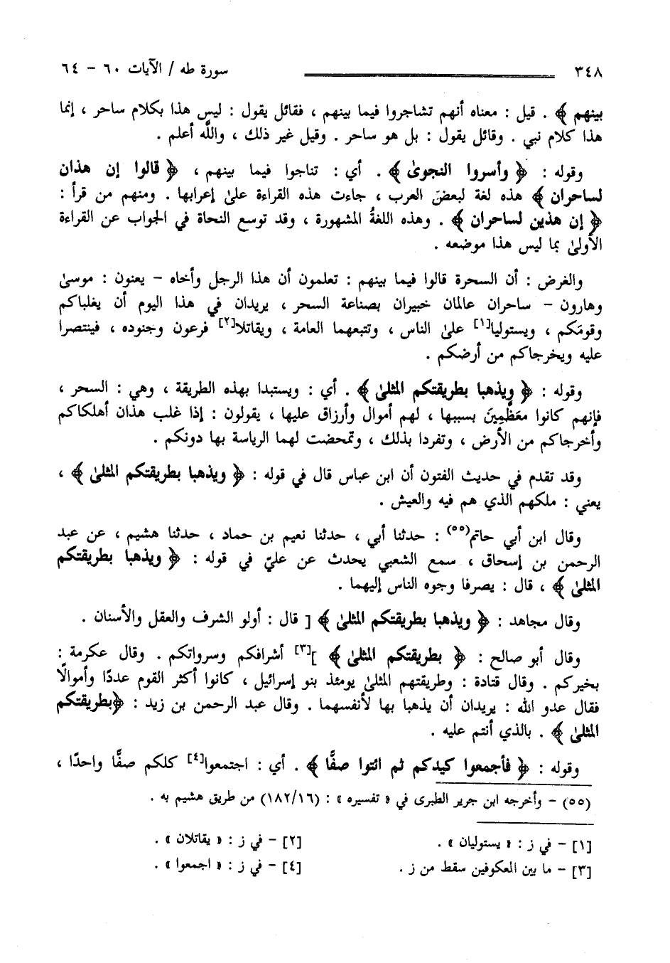 " قَالُوا إِنْ هَذَانِ لَسَاحِرَانِ " وَهَذِهِ لُغَة لِبَعْضِ الْعَرَب جَاءَتْ هَذِهِ الْقِرَاءَة عَلَى إِعْرَابهَا وَمِنْهُمْ مَنْ قَرَأَ إِنَّ هَذَيْنِ لَسَاحِرَانِ وَهَذِهِ اللُّغَة الْمَشْهُورَة وَقَدْ تَوَسَّعَ النُّحَاة فِي الْجَوَاب عَنْ الْقِرَاءَة الْأُولَى بِمَا لَيْسَ هَذَا مَوْضِعه وَالْغَرَض أَنَّ السَّحَرَة قَالُوا فِيمَا بَيْنهمْ : تَعْلَمُونَ أَنَّ هَذَا الرَّجُل وَأَخَاهُ - يَعْنُونَ مُوسَى وَهَارُون - سَاحِرَانِ عَالِمَانِ خَبِيرَانِ بِصِنَاعَةِ السِّحْر يُرِيدَانِ فِي هَذَا الْيَوْم أَنْ يَغْلِبَاكُمْ وَقَوْمكُمْ وَيَسْتَوْلِيَا عَلَى النَّاس وَتَتْبَعهُمَا الْعَامَّة وَيُقَاتِلَا فِرْعَوْن وَجُنُوده فَيُنْصَرَا عَلَيْهِ وَيُخْرِجَاكُمْ مِنْ أَرْضكُمْ وَقَوْله " وَيَذْهَبَا بِطَرِيقَتِكُمْ الْمُثْلَى " أَيْ وَيَسْتَبِدَّا بِهَذِهِ الطَّرِيقَة وَهِيَ السِّحْر فَإِنَّهُمْ كَانُوا مُعَظَّمِينَ بِسَبَبِهَا لَهُمْ أَمْوَال وَأَرْزَاق عَلَيْهَا يَقُولُونَ إِذَا غَلَبَ هَذَانِ أَهْلَكَاكُمْ وَأَخْرَجَاكُمْ مِنْ الْأَرْض وَتَفَرَّدَا بِذَلِكَ وَتَمَحَّضَتْ لَهُمَا الرِّيَاسَة بِهَا دُونكُمْ وَقَدْ تَقَدَّمَ فِي حَدِيث الْفُتُون أَنَّ اِبْن عَبَّاس قَالَ فِي قَوْله " وَيَذْهَبَا بِطَرِيقَتِكُمْ الْمُثْلَى " يَعْنِي مُلْكهمْ الَّذِي هُمْ فِيهِ وَالْعَيْش وَقَالَ اِبْن أَبِي حَاتِم حَدَّثَنَا أَبِي حَدَّثَنَا نُعَيْم بْن حَمَّاد حَدَّثَنَا هُشَيْم عَنْ عَبْد الرَّحْمَن بْن إِسْحَاق سَمِعَ الشَّعْبِيّ يُحَدِّث عَنْ عَلِيّ فِي قَوْله وَيَذْهَبَا بِطَرِيقَتِكُمْ الْمُثْلَى قَالَ يَصْرِفَانِ وُجُوه النَّاس إِلَيْهِمَا وَقَالَ مُجَاهِد وَيَذْهَبَا بِطَرِيقَتِكُمْ الْمُثْلَى قَالَ أُولُو الشَّرَف وَالْعَقْل وَالْأَسْنَان.