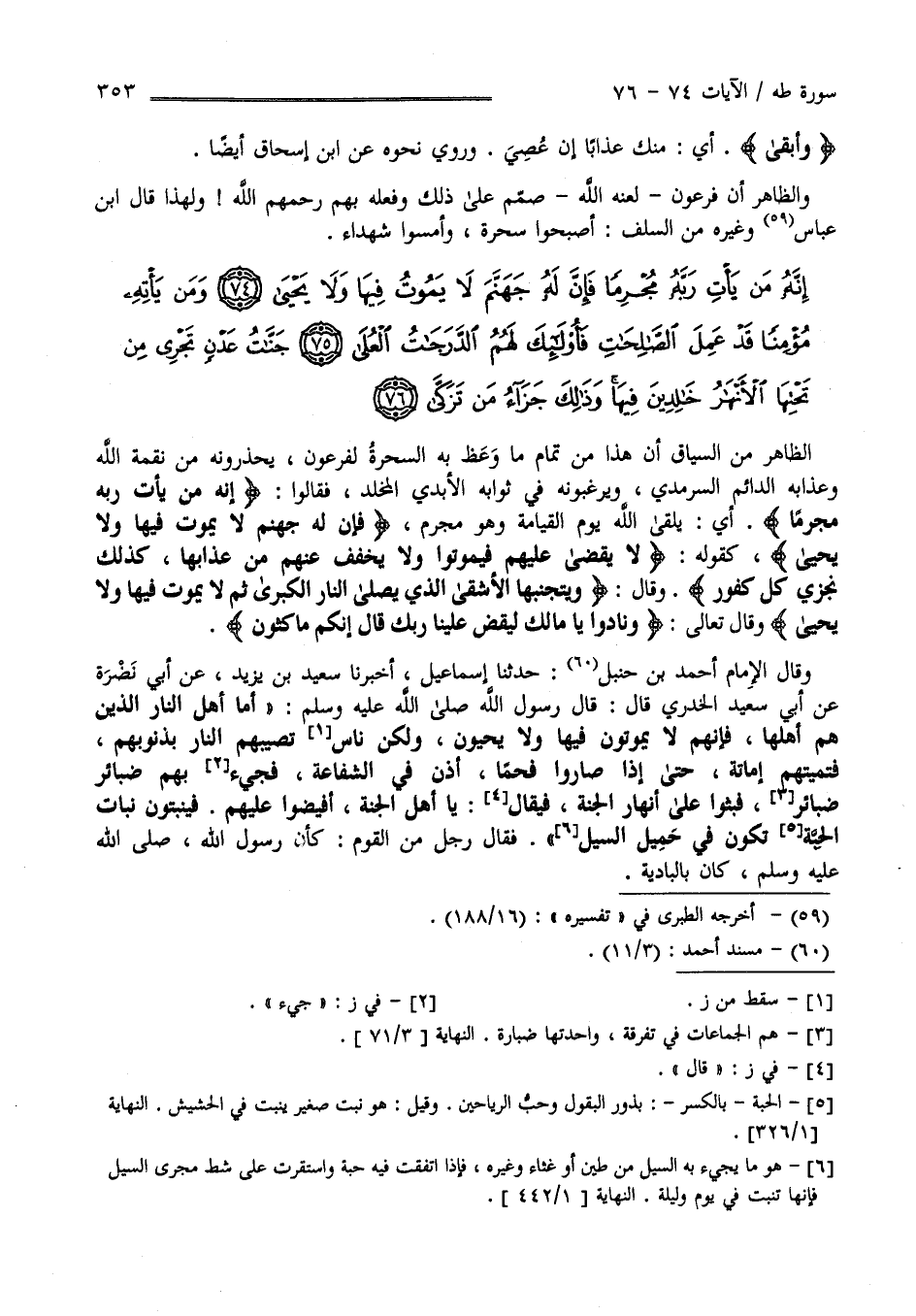 الظَّاهِر مِنْ السِّيَاق أَنَّ هَذَا مِنْ تَمَام مَا وَعَظَ بِهِ السَّحَرَة لِفِرْعَوْن يُحَذِّرُونَهُ مِنْ نِقْمَة اللَّه وَعَذَابه الدَّائِم السَّرْمَدِيّ وَيُرَغِّبُونَهُ فِي ثَوَابه الْأَبَدِيّ الْمُخَلَّد فَقَالُوا إِنَّهُ مَنْ يَأْتِ رَبّه مُجْرِمًا أَيْ يَلْقَى اللَّه يَوْم الْقِيَامَة وَهُوَ مُجْرِم فَإِنَّ لَهُ جَهَنَّم لَا يَمُوت فِيهَا وَلَا يَحْيَا كَقَوْلِهِ " لَا يُقْضَى عَلَيْهِمْ فَيَمُوتُوا وَلَا يُخَفَّف عَنْهُمْ مِنْ عَذَابهَا كَذَلِكَ نَجْزِي كُلّ كَفُور " وَقَالَ " وَيَتَجَنَّبهَا الْأَشْقَى الَّذِي يَصْلَى النَّار الْكُبْرَى ثُمَّ لَا يَمُوت فِيهَا وَلَا يَحْيَا وَقَالَ تَعَالَى " وَنَادَوْا يَا مَالِك لِيَقْضِ عَلَيْنَا رَبّك قَالَ إِنَّكُمْ مَاكِثُونَ " وَقَالَ الْإِمَام أَحْمَد بْن حَنْبَل حَدَّثَنَا إِسْمَاعِيل أَخْبَرَنَا سَعِيد بْن يَزِيد عَنْ أَبِي نَضْرَة عَنْ أَبِي سَعِيد الْخُدْرِيّ قَالَ قَالَ رَسُول اللَّه صَلَّى اللَّه عَلَيْهِ وَسَلَّمَ " أَمَّا أَهْل النَّار الَّذِينَ هُمْ أَهْلهَا فَإِنَّهُمْ لَا يَمُوتُونَ فِيهَا وَلَا يَحْيَوْنَ وَلَكِنَّ أُنَاس تُصِيبهُمْ النَّار بِذُنُوبِهِمْ فَتُمِيتهُمْ إِمَاتَة حَتَّى إِذَا صَارُوا فَحْمًا أَذِنَ فِي الشَّفَاعَة جِيءَ بِهِمْ ضَبَائِر ضَبَائِر فَبُثُّوا عَلَى أَنْهَار الْجَنَّة فَيُقَال يَا أَهْل الْجَنَّة أَفِيضُوا عَلَيْهِمْ فَيَنْبُتُونَ نَبَات الْحِبَّة تَكُون فِي حَمِيل السَّيْل " فَقَالَ رَجُل مِنْ الْقَوْم كَأَنَّ رَسُول اللَّه صَلَّى اللَّه عَلَيْهِ وَسَلَّمَ كَانَ بِالْبَادِيَةِ