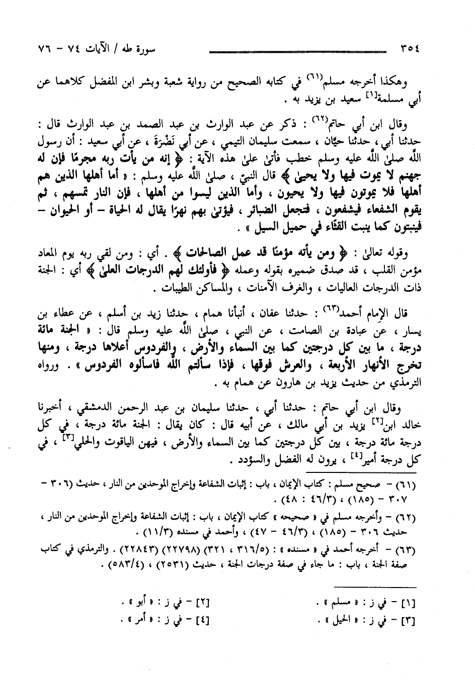 وَهَكَذَا أَخْرَجَهُ مُسْلِم فِي كِتَابه الصَّحِيح مِنْ رِوَايَة شُعْبَة وَبِشْر بْن الْمُفَضَّل كِلَاهُمَا عَنْ أَبِي سَلَمَة سَعِيد بْن يَزِيد بِهِ وَقَالَ اِبْن أَبِي حَاتِم ذُكِرَ عَنْ عَبْد الْوَارِث بْن عَبْد الصَّمَد بْن عَبْد الْوَارِث قَالَ حَدَّثَنَا أَبِي حَدَّثَنَا حِبَّان سَمِعْت سُلَيْمَان التَّيْمِيّ عَنْ أَبِي نَضْرَة عَنْ أَبِي سَعِيد أَنَّ رَسُول اللَّه صَلَّى اللَّه عَلَيْهِ وَسَلَّمَ خَطَبَ فَأَتَى عَلَى هَذِهِ الْآيَة " إِنَّهُ مَنْ يَأْتِ رَبّه مُجْرِمًا فَإِنَّ لَهُ جَهَنَّم لَا يَمُوت فِيهَا وَلَا يَحْيَا " قَالَ النَّبِيّ صَلَّى اللَّه عَلَيْهِ وَسَلَّمَ " أَمَّا أَهْلهَا الَّذِينَ هُمْ أَهْلهَا فَلَا يَمُوتُونَ فِيهَا وَلَا يَحْيَوْنَ وَأَمَّا الَّذِينَ لَيْسُوا مِنْ أَهْلهَا فَإِنَّ النَّار تَمَسّهُمْ ثُمَّ يَقُوم الشُّفَعَاء فَيَشْفَعُونَ فَتُجْعَل الضَّبَائِر فَيُؤْتَى بِهِمْ نَهَرًا يُقَال لَهُ الْحَيَاة أَوْ الْحَيَوَان فَيَنْبُتُونَ كَمَا يَنْبُت الْعُشْب فِي حَمِيل السَّيْل " .