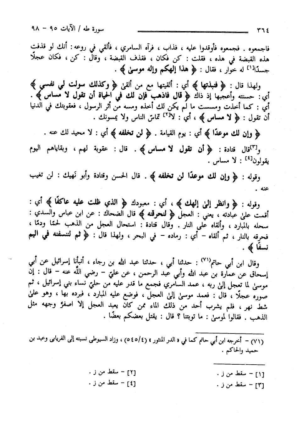 قَالَ فَاذْهَبْ فَإِنَّ لَكَ فِي الْحَيَاةِ أَنْ تَقُولَ لَا مِسَاسَ وَإِنَّ لَكَ مَوْعِدًا لَنْ تُخْلَفَهُ وَانْظُرْ إِلَى إِلَهِكَ الَّذِي ظَلْتَ عَلَيْهِ عَاكِفًا لَنُحَرِّقَنَّهُ ثُمَّ لَنَنْسِفَنَّهُ فِي الْيَمِّ نَسْفًا
