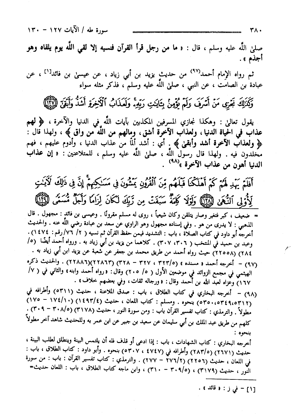 صَلَّى اللَّه عَلَيْهِ وَسَلَّمَ قَالَ : " مَا مِنْ رَجُل قَرَأَ الْقُرْآن فَنَسِيَهُ إِلَّا لَقِيَ اللَّه يَوْم يَلْقَاهُ وَهُوَ أَجْذَم " ثُمَّ رَوَاهُ الْإِمَام أَحْمَد مِنْ حَدِيث يَزِيد بْن أَبِي زِيَاد عَنْ عِيسَى بْن فَائِد عَنْ عُبَادَة بْن الصَّامِت عَنْ النَّبِيّ صَلَّى اللَّه عَلَيْهِ وَسَلَّمَ فَذَكَرَ مِثْله سَوَاء .