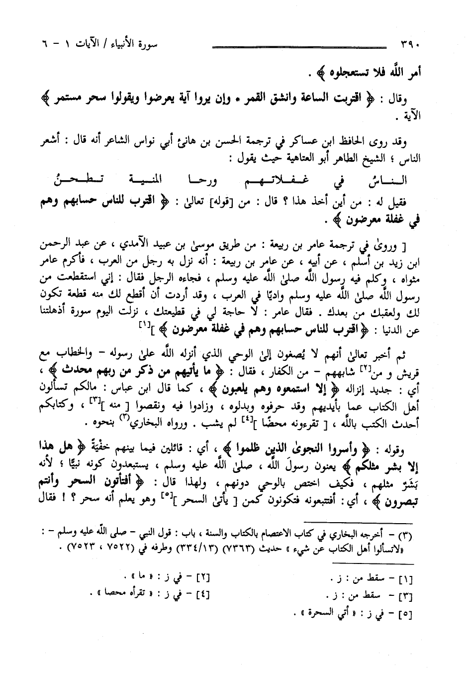 فَقِيلَ لَهُ مِنْ أَيْنَ أُخِذَ هَذَا ؟ قَالَ مِنْ قَوْل اللَّه تَعَالَى " اِقْتَرَبَ لِلنَّاسِ حِسَابهمْ وَهُمْ فِي غَفْلَة مُعْرِضُونَ " وَرُوِيَ فِي تَرْجَمَة عَامِر بْن رَبِيعَة مِنْ طَرِيق مُوسَى بْن عُبَيْد الْآمِدِيّ عَنْ عَبْد الرَّحْمَن بْن زَيْد بْن أَسْلَم عَنْ أَبِيهِ عَنْ عَامِر اِبْن رَبِيعَة أَنَّهُ نَزَلَ بِهِ رَجُل مِنْ الْعَرَب فَأَكْرَمَ عَامِرٌ مَثْوَاهُ وَكَلَّمَ فِيهِ رَسُول اللَّه صَلَّى اللَّه عَلَيْهِ وَسَلَّمَ فَجَاءَهُ الرَّجُل فَقَالَ إِنِّي اِسْتَقْطَعْت مِنْ رَسُول اللَّه صَلَّى اللَّه عَلَيْهِ وَسَلَّمَ وَادِيًا فِي الْعَرَب وَقَدْ أَرَدْت أَنْ أَقْطَع لَك مِنْهُ قِطْعَة تَكُون لَك وَلِعَقِبِك مِنْ بَعْدك فَقَالَ عَامِر لَا حَاجَة لِي فِي قَطِيعَتك نَزَلَتْ الْيَوْم سُورَة أَذْهَلَتْنَا عَنْ الدُّنْيَا " اِقْتَرَبَ لِلنَّاسِ حِسَابهمْ وَهُمْ فِي غَفْلَة مُعْرِضُونَ " ثُمَّ أَخْبَرَ تَعَالَى أَنَّهُمْ لَا يُصْغُونَ إِلَى الْوَحْي الَّذِي أَنْزَلَ اللَّه عَلَى رَسُوله وَالْخِطَاب مَعَ قُرَيْش وَمَنْ شَابَهَهُمْ مِنْ الْكُفَّار فَقَالَ .