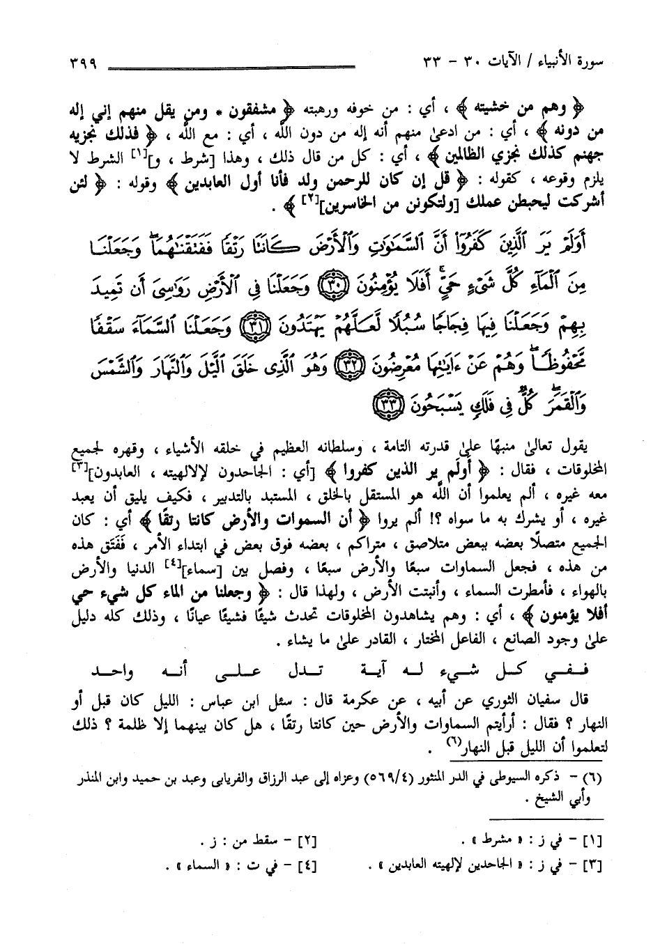 الْمَاء كُلّ شَيْء حَيّ أَفَلَا يُؤْمِنُونَ يَقُول تَعَالَى مُنَبِّهًا عَلَى قُدْرَته التَّامَّة وَسُلْطَانه الْعَظِيم فِي خَلْقه الْأَشْيَاء وَقَهْره لِجَمِيعِ الْمَخْلُوقَات فَقَالَ " أَوَلَمْ يَرَ الَّذِينَ كَفَرُوا " أَيْ الْجَاحِدُونَ لِإِلَهِيَّتِهِ الْعَابِدُونَ مَعَهُ غَيْره أَلَمْ يَعْلَمُوا أَنَّ اللَّه هُوَ الْمُسْتَقِلّ بِالْخَلْقِ الْمُسْتَبِدّ بِالتَّدْبِيرِ فَكَيْف يَلِيق أَنْ يُعْبَد مَعَهُ غَيْره أَوْ يُشْرَك بِهِ مَا سِوَاهُ أَلَمْ يَرَوْا أَنَّ السَّمَوَات وَالْأَرْض كَانَتَا رَتْقًا أَيْ كَانَ الْجَمِيع مُتَّصِلًا بَعْضه بِبَعْضٍ مُتَلَاصِق مُتَرَاكِم بَعْضه فَوْق بَعْض فِي اِبْتِدَاء الْأَمْر فَفَتَقَ هَذِهِ مِنْ هَذِهِ فَجَعَلَ السَّمَوَات سَبْعًا وَالْأَرْض سَبْعًا وَفَصَلَ بَيْن السَّمَاء الدُّنْيَا وَالْأَرْض بِالْهَوَاءِ فَأَمْطَرَتْ السَّمَاء وَأَنْبَتَتْ الْأَرْض وَلِهَذَا قَالَ " وَجَعَلْنَا مِنْ الْمَاء كُلّ شَيْء حَيّ أَفَلَا يُؤْمِنُونَ " أَيْ وَهُمْ يُشَاهِدُونَ الْمَخْلُوقَات تَحْدُث شَيْئًا فَشَيْئًا عِيَانًا وَذَلِكَ كُلّه دَلِيل عَلَى وُجُود الصَّانِع الْفَاعِل الْمُخْتَار الْقَادِر عَلَى مَا يَشَاء .