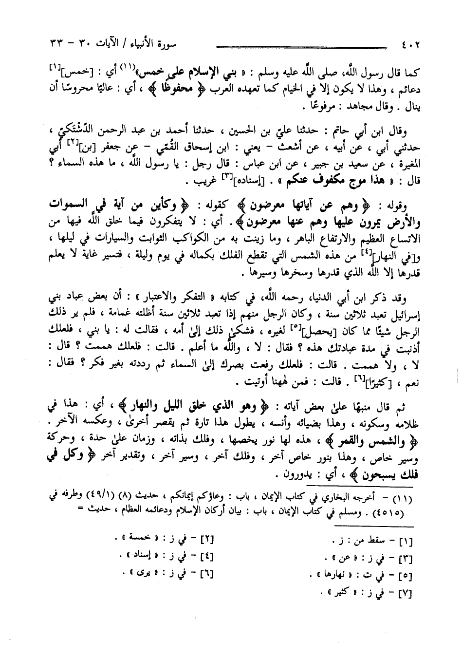 وَقَالَ اِبْن أَبِي حَاتِم حَدَّثَنَا عَلِيّ بْن الْحُسَيْن حَدَّثَنَا أَحْمَد بْن عَبْد الرَّحْمَن الدَّشْتَكِيّ حَدَّثَنِي أَبِي عَنْ أَبِيهِ عَنْ أَشْعَث يَعْنِي اِبْن إِسْحَاق الْقُمِّيّ عَنْ جَعْفَر بْن أَبِي الْمُغِيرَة عَنْ سَعِيد بْن جُبَيْر عَنْ اِبْن عَبَّاس قَالَ رَجُل يَا رَسُول اللَّه مَا هَذِهِ السَّمَاء قَالَ " مَوْج مَكْفُوف عَنْكُمْ" إِسْنَاده غَرِيب وَقَوْله " وَهُمْ عَنْ آيَاتهَا مُعْرِضُونَ " كَقَوْلِهِ" وَكَأَيِّنْ مِنْ آيَة فِي السَّمَوَات وَالْأَرْض يَمُرُّونَ عَلَيْهَا وَهُمْ عَنْهَا مُعْرِضُونَ " أَيْ لَا يَتَفَكَّرُونَ فِيمَا خَلَقَ اللَّه فِيهَا مِنْ الِاتِّسَاع الْعَظِيم وَالِارْتِفَاع الْبَاهِر وَمَا زُيِّنَتْ بِهِ مِنْ الْكَوَاكِب الثَّوَابِت وَالسَّيَّارَات فِي لَيْلهَا وَنَهَارهَا مِنْ هَذِهِ الشَّمْس الَّتِي تَقْطَع الْفُلْك بِكَمَالِهِ فِي يَوْم وَلَيْلَة فَتَسِير غَايَة لَا يَعْلَم قَدْرهَا إِلَّا اللَّه الَّذِي قَدَّرَهَا وَسَخَّرَهَا وَسَيَّرَهَا .