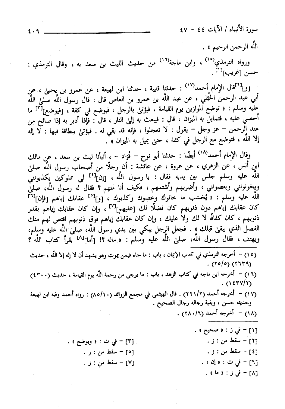 اللَّه الرَّحْمَن الرَّحِيم " وَرَوَاهُ التِّرْمِذِيّ وَابْن مَاجَهْ مِنْ حَدِيث اللَّيْث بْن سَعْد وَقَالَ التِّرْمِذِيّ حَسَن غَرِيب وَقَالَ الْإِمَام أَحْمَد حَدَّثَنَا قُتَيْبَة حَدَّثَنَا اِبْن لَهِيعَة عَنْ عَمْرو بْن يَحْيَى عَنْ أَبِي عَبْد الرَّحْمَن الْحُبُلِيّ عَنْ عَبْد اللَّه بْن عَمْرو بْن الْعَاص قَالَ قَالَ رَسُول اللَّه " صَلَّى اللَّه عَلَيْهِ وَسَلَّمَ" : " تُوضَع الْمَوَازِين يَوْم الْقِيَامَة فَيُؤْتَى بِالرَّجُلِ فَيُوضَع فِي كِفَّة وَيُوضَع مَا أُحْصِيَ عَلَيْهِ فَيَمِيل بِهِ الْمِيزَان قَالَ فَيُبْعَث بِهِ إِلَى النَّار قَالَ فَإِذَا أُدْبِرَ بِهِ إِذَا صَائِح مِنْ عِنْد الرَّحْمَن عَزَّ وَجَلَّ يَقُول لَا تَعْجَلُوا فَإِنَّهُ قَدْ بَقِيَ لَهُ فَيُؤْتَى بِبِطَاقَةٍ فِيهَا : " لَا إِلَه إِلَّا اللَّه " فَتُوضَع مَعَ الرَّجُل فِي كِفَّة حَتَّى يَمِيل بِهِ الْمِيزَان" وَقَالَ الْإِمَام أَحْمَد أَيْضًا : حَدَّثَنَا أَبُو