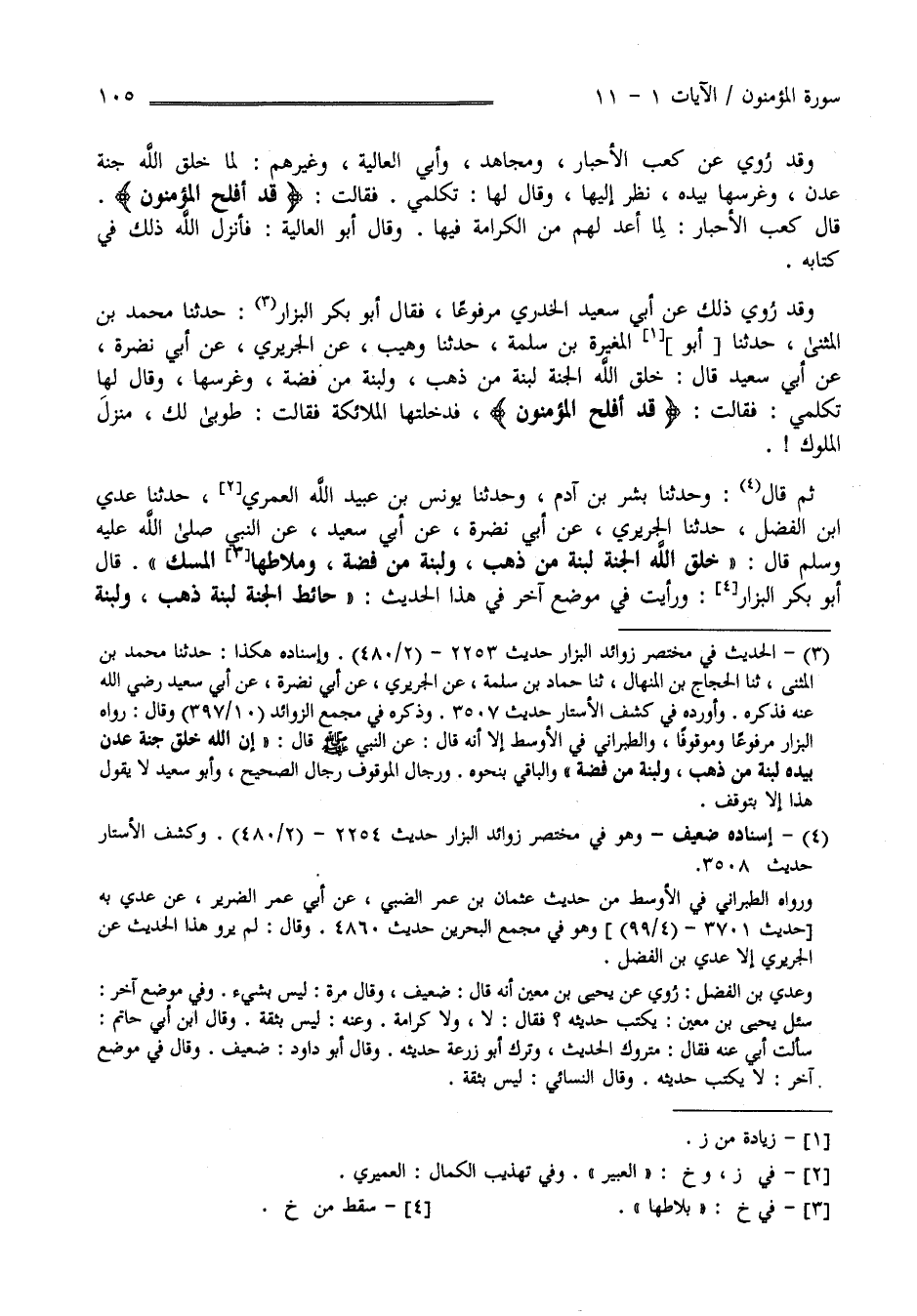 وَقَدْ رُوِيَ عَنْ كَعْب الْأَحْبَار وَمُجَاهِد وَأَبِي الْعَالِيَة وَغَيْرهمْ لَمَّا خَلَقَ اللَّه جَنَّة عَدْن وَغَرَسَهَا بِيَدِهِ نَظَرَ إِلَيْهَا وَقَالَ لَهَا تَكَلَّمِي فَقَالَتْ " قَدْ أَفْلَحَ الْمُؤْمِنُونَ " قَالَ كَعْب الْأَحْبَار لِمَا أَعَدَّ لَهُمْ مِنْ الْكَرَامَة فِيهَا وَقَالَ أَبُو الْعَالِيَة فَأَنْزَلَ اللَّه ذَلِكَ فِي كِتَابه وَقَدْ رُوِيَ ذَلِكَ عَنْ أَبِي سَعِيد الْخُدْرِيّ مَرْفُوعًا فَقَالَ أَبُو بَكْر الْبَزَّار حَدَّثَنَا مُحَمَّد بْن الْمُثَنَّى حَدَّثَنَا الْمُغِيرَة بْن سَلَمَة حَدَّثَنَا وُهَيْب عَنْ الْجُرَيْرِيّ عَنْ أَبِي نَضْرَة عَنْ أَبِي سَعِيد قَالَ : خَلَقَ اللَّه الْجَنَّة لَبِنَة مِنْ ذَهَب وَلَبِنَة مِنْ فِضَّة وَغَرَسَهَا وَقَالَ لَهَا تَكَلَّمِي فَقَالَتْ " قَدْ أَفْلَحَ الْمُؤْمِنُونَ" فَدَخَلَتْهَا الْمَلَائِكَة فَقَالَتْ طُوبَى لَك مَنْزِل الْمُلُوك ثُمَّ قَالَ وَحَدَّثَنَا بِشْر بْن آدَم وَحَدَّثَنَا يُونُس بْن عُبَيْد اللَّه الْعُمَرِيّ حَدَّثَنَا عَدِيّ بْن الْفَضْل حَدَّثَنَا الْجُرَيْرِيّ عَنْ أَبِي نَضْرَة عَنْ أَبِي سَعِيد عَنْ النَّبِيّ صَلَّى اللَّه عَلَيْهِ وَسَلَّمَ قَالَ " خَلَقَ اللَّه الْجَنَّة لَبِنَة مِنْ ذَهَب وَلَبِنَة مِنْ فِضَّة وَمِلَاطهَا الْمِسْك - قَالَ الْبَزَّار وَرَأَيْت فِي مَوْضِع آخَر فِي هَذَا الْحَدِيث - حَائِط الْجَنَّة لَبِنَة ذَهَب وَلَبِنَة