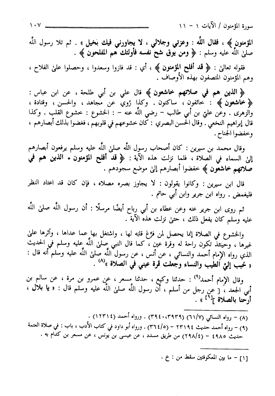 " الَّذِينَ هُمْ فِي صَلَاتهمْ خَاشِعُونَ " قَالَ عَلِيّ بْن أَبِي طَلْحَة عَنْ اِبْن عَبَّاس" خَاشِعُونَ " خَائِفُونَ سَاكِنُونَ وَكَذَا رُوِيَ عَنْ مُجَاهِد وَالْحَسَن وَقَتَادَة وَالزُّهْرِيّ وَعَنْ عَلِيّ بْن أَبِي طَالِب" الْخُشُوع خُشُوع الْقَلْب وَكَذَا قَالَ إِبْرَاهِيم النَّخَعِيّ وَقَالَ الْحَسَن الْبَصْرِيّ كَانَ خُشُوعهمْ فِي قُلُوبهمْ فَغَضُّوا بِذَلِكَ أَبْصَارهمْ وَخَفَضُوا الْجَنَاح وَقَالَ مُحَمَّد بْن سِيرِينَ كَانَ أَصْحَاب رَسُول اللَّه صَلَّى اللَّه عَلَيْهِ وَسَلَّمَ يَرْفَعُونَ أَبْصَارهمْ إِلَى السَّمَاء فِي الصَّلَاة فَلَمَّا نَزَلَتْ هَذِهِ الْآيَة " قَدْ أَفْلَحَ الْمُؤْمِنُونَ الَّذِينَ هُمْ فِي صَلَاتهمْ خَاشِعُونَ " خَفَضُوا أَبْصَارهمْ إِلَى مَوْضِع سُجُودهمْ قَالَ مُحَمَّد بْن سِيرِينَ وَكَانُوا يَقُولُونَ لَا يُجَاوِز بَصَره مُصَلَّاهُ فَإِنْ كَانَ قَدْ اِعْتَادَ النَّظَر فَلْيُغْمِضْ رَوَاهُ اِبْن جَرِير وَابْن حَاتِم ثُمَّ رَوَى اِبْن جَرِير عَنْهُ وَعَنْ عَطَاء بْن أَبِي رَبَاح أَيْضًا مُرْسَلًا أَنَّ رَسُول اللَّه كَانَ يَفْعَل ذَلِكَ حَتَّى نَزَلَتْ هَذِهِ الْآيَة وَالْخُشُوع فِي الصَّلَاة إِنَّمَا يَحْصُل لِمَنْ فَرَغَ قَلْبه لَهَا وَاشْتَغَلَ بِهَا عَمَّا عَدَاهَا وَآثَرَهَا عَلَى غَيْرهَا وَحِينَئِذٍ تَكُون رَاحَة لَهُ وَقُرَّة عَيْن كَمَا قَالَ النَّبِيّ صَلَّى اللَّه عَلَيْهِ وَسَلَّمَ فِي الْحَدِيث الَّذِي رَوَاهُ الْإِمَام أَحْمَد وَالنَّسَائِيّ عَنْ أَبِي عَنْ رَسُول اللَّه صَلَّى اللَّه عَلَيْهِ وَسَلَّمَ أَنَّهُ قَالَ " حُبِّبَ إِلَيَّ الطِّيب وَالنِّسَاء وَجُعِلَتْ قُرَّة عَيْنِي فِي الصَّلَاة " .