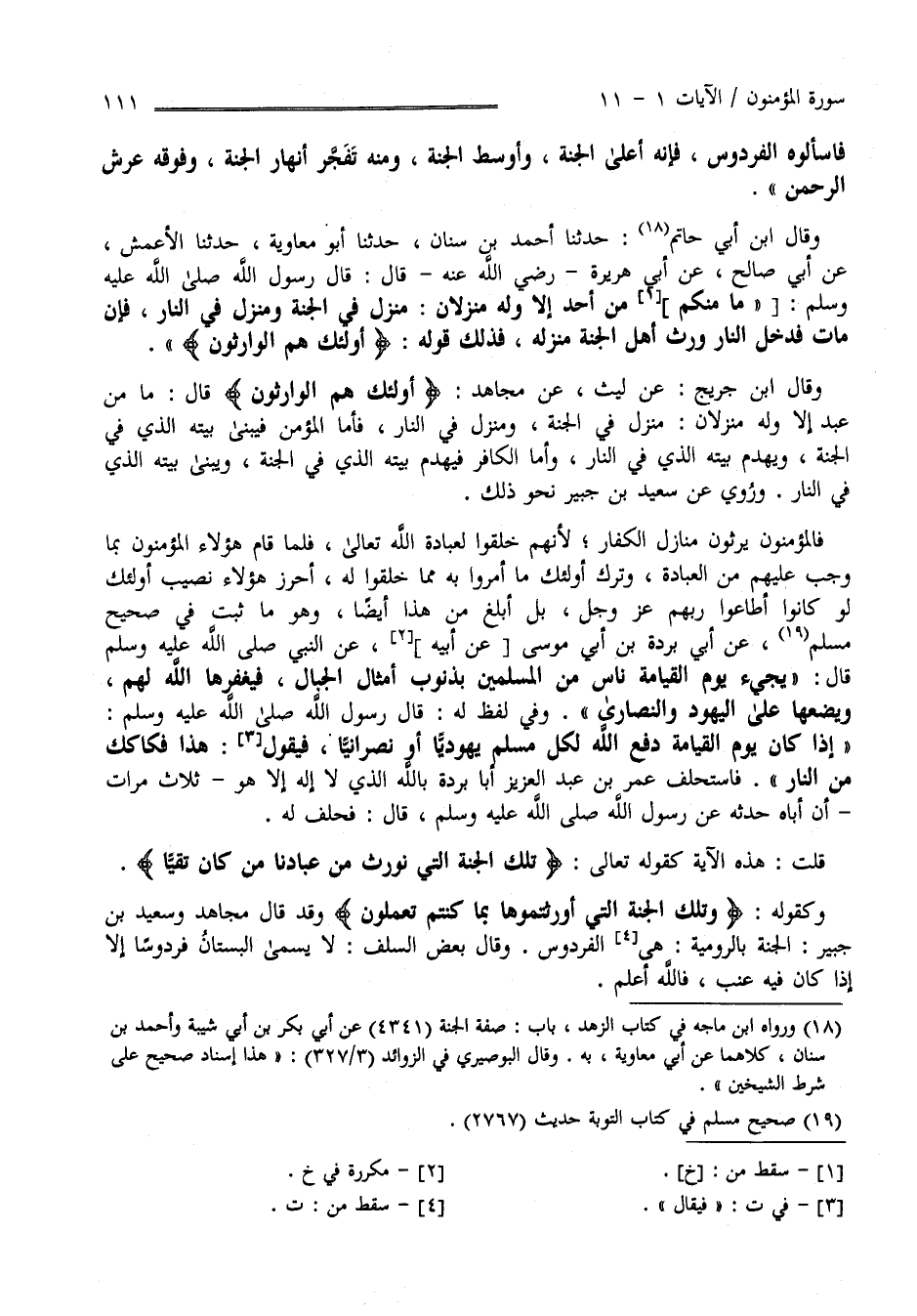 فَاسْأَلُوهُ الْفِرْدَوْس فَإِنَّهُ أَعْلَى الْجَنَّة وَأَوْسَط الْجَنَّة وَمِنْهُ تُفَجَّر أَنْهَار الْجَنَّة وَفَوْقه عَرْش الرَّحْمَن " وَقَالَ اِبْن أَبِي حَاتِم حَدَّثَنَا أَحْمَد بْن سِنَان حَدَّثَنَا أَبُو مُعَاوِيَة حَدَّثَنَا الْأَعْمَش عَنْ أَبِي صَالِح عَنْ أَبِي هُرَيْرَة رَضِيَ اللَّه عَنْهُ قَالَ : قَالَ رَسُول اللَّه صَلَّى اللَّه عَلَيْهِ وَسَلَّمَ" مَا مِنْكُمْ مِنْ أَحَد إِلَّا وَلَهُ مَنْزِلَانِ مَنْزِل فِي الْجَنَّة وَمَنْزِل فِي النَّار فَإِنْ مَاتَ وَدَخَلَ النَّار وَرِثَ أَهْل الْجَنَّة مَنْزِله " فَذَلِكَ قَوْله أُولَئِكَ هُمْ الْوَارِثُونَ وَقَالَ اِبْن جُرَيْج عَنْ اللَّيْث عَنْ مُجَاهِد " أُولَئِكَ الْوَارِثُونَ قَالَ مَا مِنْ عَبْد إِلَّا وَلَهُ مَنْزِلَانِ مَنْزِل فِي الْجَنَّة وَمَنْزِل فِي النَّار فَأَمَّا الْمُؤْمِن فَيَبْنِي بَيْته الَّذِي فِي الْجَنَّة وَيَهْدِم بَيْته الَّذِي فِي النَّار وَأَمَّا الْكَافِر فَيَهْدِم بَيْته الَّذِي فِي الْجَنَّة وَيَبْنِي بَيْته الَّذِي فِي النَّار وَرُوِيَ عَنْ سَعِيد بْن جُبَيْر نَحْو ذَلِكَ فَالْمُؤْمِنُونَ يَرِثُونَ مَنَازِل الْكُفَّار لِأَنَّهُمْ خُلِقُوا لِعِبَادَةِ اللَّه تَعَالَى وَحْده لَا شَرِيك لَهُ فَلَمَّا قَامَ هَؤُلَاءِ الْمُؤْمِنُونَ بِمَا وَجَبَ عَلَيْهِمْ مِنْ الْعِبَادَة وَتَرَكَ أُولَئِكَ مَا أُمِرُوا بِهِ مِمَّا خُلِقُوا لَهُ أَحْرَزَ هَؤُلَاءِ نَصِيب أُولَئِكَ لَوْ كَانُوا أَطَاعُوا رَبّهمْ عَزَّ وَجَلَّ بَلْ أَبْلَغ مِنْ هَذَا أَيْضًا وَهُوَ مَا ثَبَتَ فِي صَحِيح مُسْلِم عَنْ أَبِي بُرْدَة بْن أَبِي مُوسَى عَنْ أَبِيهِ عَنْ النَّبِيّ صَلَّى اللَّه عَلَيْهِ وَسَلَّمَ قَالَ " يَجِيء نَاس يَوْم الْقِيَامَة مِنْ الْمُسْلِمِينَ بِذُنُوبٍ أَمْثَال الْجِبَال فَيَغْفِرهَا اللَّه لَهُمْ وَيَضَعهَا عَلَى الْيَهُود وَالنَّصَارَى " وَفِي لَفْظ قَوْله قَالَ رَسُول اللَّه صَلَّى اللَّه عَلَيْهِ وَسَلَّمَ : " إِذَا كَانَ يَوْم الْقِيَامَة دَفَعَ اللَّه لِكُلِّ مُسْلِم يَهُودِيًّا أَوْ نَصْرَانِيًّا فَيُقَال هَذَا فِكَاكك مِنْ النَّار " فَاسْتَحْلَفَ عُمَر بْن عَبْد الْعَزِيز أَبَا بُرْدَة بِاَللَّهِ الَّذِي لَا إِلَه إِلَّا هُوَ ثَلَاث مَرَّات أَنَّ أَبَاهُ حَدَّثَهُ عَنْ رَسُول اللَّه صَلَّى اللَّه عَلَيْهِ وَسَلَّمَ بِذَلك قَالَ فَحَلَفَ لَهُ قُلْت وَهَذِهِ الْآيَة كَقَوْلِهِ تَعَالَى " تِلْكَ الْجَنَّة الَّتِي نُورِث مِنْ عِبَادنَا مَنْ كَانَ تَقِيًّا " وَكَقَوْلِهِ" وَتِلْكَ الْجَنَّة الَّتِي أُورِثْتُمُوهَا بِمَا كُنْتُمْ تَعْمَلُونَ وَقَدْ قَالَ مُجَاهِد وَسَعِيد بْن جُبَيْر الْجَنَّة بِالرُّومِيَّةِ هِيَ الْفِرْدَوْس وَقَالَ بَعْض السَّلَف لَا يُسَمَّى الْبُسْتَان الْفِرْدَوْس إِلَّا إِذَا كَانَ فِيهِ عِنَب فَاَللَّه أَعْلَم .