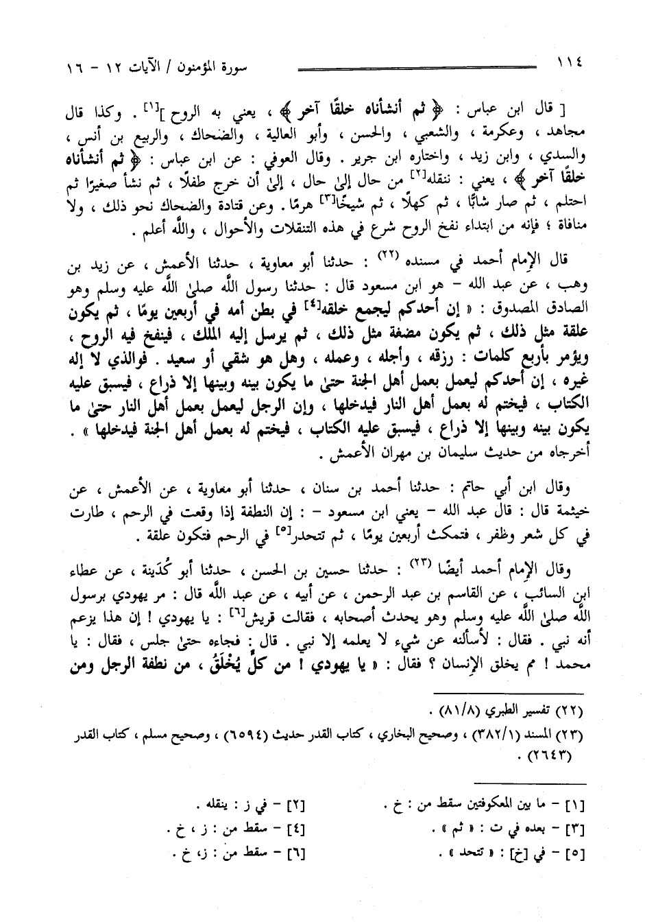 قَالَ اِبْن عَبَّاس " ثُمَّ أَنْشَأْنَاهُ خَلْقًا آخَر " يَعْنِي نَفَخْنَا فِيهِ الرُّوح وَكَذَا قَالَ مُجَاهِد وَعِكْرِمَة وَالشَّعْبِيّ وَالْحَسَن وَأَبُو الْعَالِيَة وَالضَّحَّاك وَالرَّبِيع بْن أَنَس وَالسُّدِّيّ وَابْن زَيْد وَاخْتَارَهُ اِبْن جَرِير وَقَالَ الْعَوْفِيّ عَنْ اِبْن عَبَّاس " خَلْقًا آخَر " يَعْنِي فَنَقَلَهُ مِنْ حَال إِلَى حَال إِلَى أَنْ خَرَجَ طِفْلًا ثُمَّ نَشَأَ صَغِيرًا ثُمَّ اِحْتَلَمَ ثُمَّ صَارَ شَابًّا ثُمَّ كَهْلًا ثُمَّ شَيْخًا ثُمَّ هَرِمًا وَعَنْ قَتَادَة وَالضَّحَّاك نَحْو ذَلِكَ وَلَا مُنَافَاة فَإِنَّهُ مِنْ اِبْتِدَاء نَفْخ الرُّوح فِيهِ شُرِعَ فِي هَذِهِ التَّنَقُّلَات وَالْأَحْوَال وَاَللَّه أَعْلَم قَالَ الْإِمَام أَحْمَد فِي مُسْنَده حَدَّثَنَا أَبُو مُعَاوِيَة حَدَّثَنَا الْأَعْمَش عَنْ زَيْد بْن وَهْب عَنْ عَبْد اللَّه - هُوَ اِبْن مَسْعُود رَضِيَ اللَّه عَنْهُ قَالَ حَدَّثَنَا رَسُول اللَّه صَلَّى اللَّه عَلَيْهِ وَسَلَّمَ وَهُوَ الصَّادِق الْمَصْدُوق" إِنَّ أَحَدكُمْ لَيُجْمَع خَلْقه فِي بَطْن أُمّه أَرْبَعِينَ يَوْمًا ثُمَّ يَكُون عَلَقَة مِثْل ذَلِكَ ثُمَّ يَكُون مُضْغَة مِثْل ذَلِكَ ثُمَّ يُرْسَل إِلَيْهِ الْمَلَك فَيَنْفُخ فِيهِ الرُّوح وَيُؤْمَر بِأَرْبَعِ كَلِمَات : رِزْقه وَأَجَله وَعَمَله وَهَلْ هُوَ شَقِيّ أَوْ سَعِيد فَوَالَّذِي لَا إِلَه غَيْره إِنَّ أَحَدكُمْ لَيَعْمَل بِعَمَلِ أَهْل