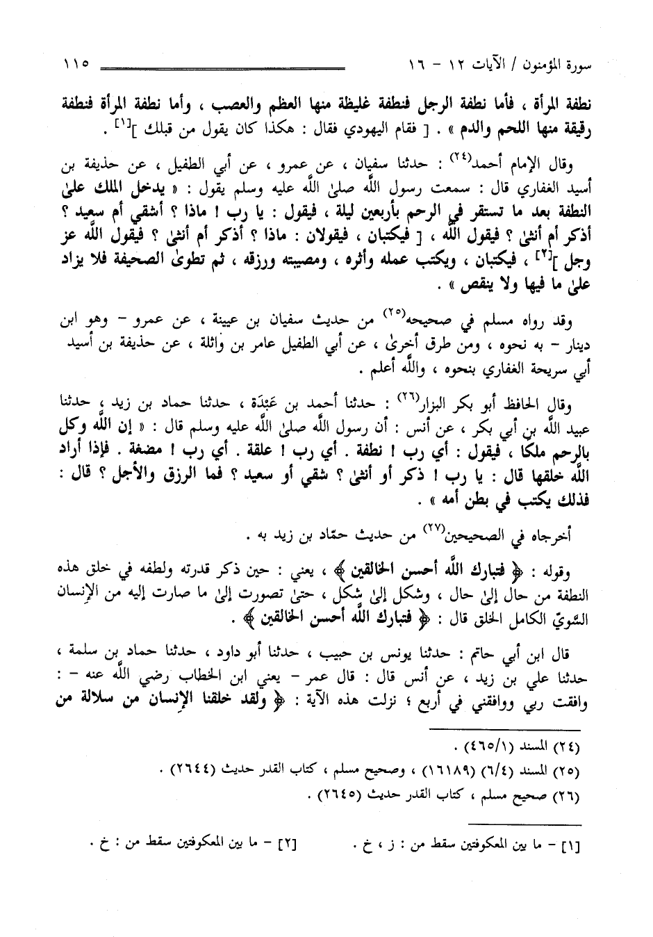 وَمِنْ طَرِيق - أُخْرَى عَنْ أَبِي الطُّفَيْل عَامِر بْن وَاثِلَة عَنْ حُذَيْفَة بْن أَسِيد عَنْ اِبْن شُرَيْحَة الْغِفَارِيّ بِنَحْوِهِ وَاَللَّه أَعْلَم وَقَالَ الْحَافِظ أَبُو بَكْر الْبَزَّار حَدَّثَنَا أَحْمَد بْن عَبْدَة حَدَّثَنَا حَمَّاد بْن زَيْد حَدَّثَنَا عُبَيْد اللَّه بْن أَبِي بَكْر عَنْ أَنَس أَنَّ رَسُول اللَّه صَلَّى اللَّه عَلَيْهِ وَسَلَّمَ قَالَ " إِنَّ اللَّه وَكَّلَ بِالرَّحِمِ مَلَكًا فَيَقُول أَيْ رَبّ نُطْفَة أَيْ رَبّ عَلَقَة أَيْ رَبّ مُضْغَة فَإِذَا أَرَادَ اللَّه خَلْقهَا قَالَ أَيْ رَبّ ذَكَر أَوْ أُنْثَى ؟ شَقِيّ أَوْ سَعِيد ؟ فَمَا الرِّزْق وَالْأَجَل ؟ قَالَ فَذَلِكَ يُكْتَب فِي بَطْن أُمّه " أَخْرَجَاهُ فِي الصَّحِيحَيْنِ مِنْ حَدِيث حَمَّاد بْن زَيْد بِهِ وَقَوْله " فَتَبَارَكَ اللَّه أَحْسَن الْخَالِقِينَ" يَعْنِي حِين ذَكَرَ قُدْرَته وَلُطْفه فِي خَلْق هَذِهِ النُّطْفَة مِنْ حَال إِلَى حَال .