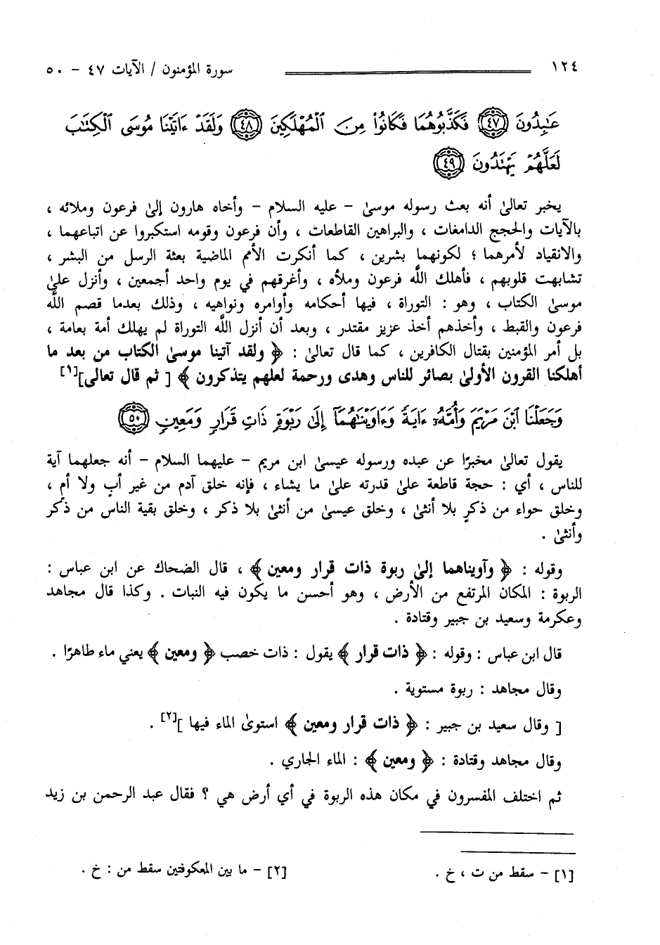 يَقُول تَعَالَى مُخْبِرًا عَنْ عَبْده وَرَسُوله عِيسَى اِبْن مَرْيَم عَلَيْهِ الصَّلَاة وَالسَّلَام أَنَّهُ جَعَلَهُمَا آيَة لِلنَّاسِ أَيْ حُجَّة قَاطِعَة عَلَى قُدْرَته عَلَى مَا يَشَاء فَإِنَّهُ خَلَقَ آدَم مِنْ غَيْر أَب وَلَا أُمّ وَخَلَقَ حَوَّاء مِنْ ذَكَر بِلَا أُنْثَى وَخَلَقَ عِيسَى مِنْ أُنْثَى بِلَا ذَكَر وَخَلَقَ بَقِيَّة النَّاس مِنْ ذَكَر وَأُنْثَى وَقَوْله " وَآوَيْنَاهُمَا إِلَى رَبْوَة ذَات قَرَار وَمَعِين " قَالَ الضَّحَّاك عَنْ اِبْن عَبَّاس : الرَّبْوَة الْمَكَان الْمُرْتَفِع مِنْ الْأَرْض وَهُوَ أَحْسَن مَا يَكُون فِيهِ النَّبَات وَكَذَا قَالَ مُجَاهِد وَعِكْرِمَة وَسَعِيد بْن جُبَيْر وَقَتَادَة قَالَ اِبْن عَبَّاس : وَقَوْله " ذَات قَرَار" يَقُول ذَات خِصْب " وَمَعِين " يَعْنِي مَاء ظَاهِرًا وَكَذَا قَالَ مُجَاهِد وَعِكْرِمَة وَسَعِيد بْن جُبَيْر وَقَتَادَة وَقَالَ مُجَاهِد رَبْوَة مُسْتَوِيَة وَقَالَ سَعِيد بْن جُبَيْر " ذَات قَرَار وَمَعِين" اِسْتَوَى الْمَاء فِيهَا وَقَالَ مُجَاهِد وَقَتَادَة " وَمَعِين" الْمَاء الْجَارِي .