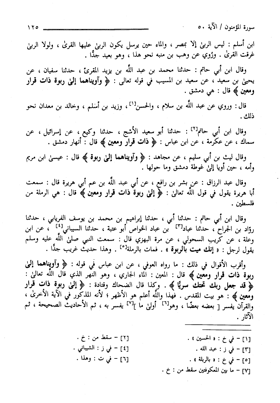 وَرَوَى اِبْن أَبِي حَاتِم عَنْ سَعِيد بْن الْمُسَيِّب فِي قَوْله " وَآوَيْنَاهُمَا إِلَى رَبْوَة ذَات قَرَار وَمَعِين " قَالَ هِيَ دِمَشْق قَالَ وَرُوِيَ عَنْ عَبْد اللَّه بْن سَلَام وَالْحَسَن وَزَيْد بْن أَسْلَم وَخَاله بْن مَعْدَان نَحْو ذَلِكَ .
