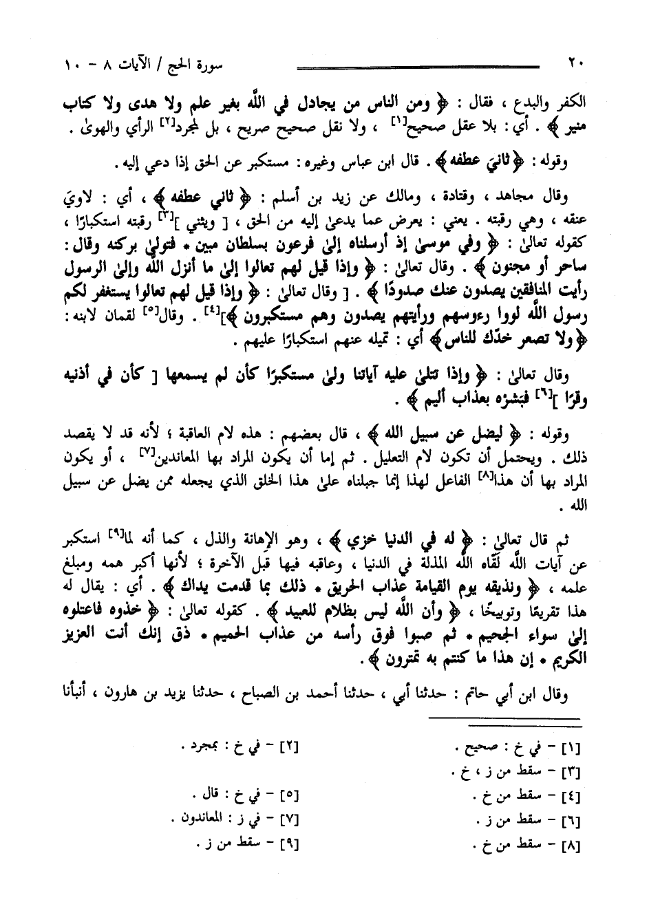 وَقَوْله " ثَانِيَ عِطْفه " قَالَ اِبْن عَبَّاس وَغَيْره مُسْتَكْبِر عَنْ الْحَقّ إِذَا دُعِيَ إِلَيْهِ وَقَالَ مُجَاهِد وَقَتَادَة وَمَالِك عَنْ زَيْد بْن أَسْلَم " ثَانِيَ عِطْفه " أَيْ لَاوِيَ عِطْفه وَهِيَ رَقَبَته يَعْنِي يُعْرِض عَمَّا يُدْعَى إِلَيْهِ مِنْ الْحَقّ وَيَثْنِي رَقَبَته اِسْتِكْبَارًا كَقَوْلِهِ تَعَالَى " وَفِي مُوسَى إِذْ أَرْسَلْنَاهُ إِلَى فِرْعَوْن بِسُلْطَانٍ مُبِين فَتَوَلَّى بِرُكْنِهِ " الْآيَة وَقَالَ تَعَالَى " وَإِذَا قِيلَ لَهُمْ تَعَالَوْا إِلَى مَا أَنْزَلَ اللَّه وَإِلَى الرَّسُول رَأَيْت الْمُنَافِقِينَ يَصُدُّونَ عَنْك صُدُودًا " وَقَالَ تَعَالَى " وَإِذَا قِيلَ لَهُمْ تَعَالَوْا يَسْتَغْفِر لَكُمْ رَسُول اللَّه لَوَّوْا رُءُوسهمْ وَرَأَيْتهمْ يَصُدُّونَ وَهُمْ مُسْتَكْبِرُونَ " وَقَالَ لُقْمَان لِابْنِهِ " وَلَا تُصَعِّر خَدّك لِلنَّاسِ " أَيْ تُمِيلهُ عَنْهُمْ اِسْتِكْبَارًا عَلَيْهِمْ وَقَالَ تَعَالَى " وَإِذَا تُتْلَى عَلَيْهِ آيَاتنَا وَلَّى مُسْتَكْبِرًا " الْآيَة وَقَوْله " لِيُضِلّ عَنْ سَبِيل اللَّه " قَالَ بَعْضهمْ هَذِهِ " لَام الْعَاقِبَة " لِأَنَّهُ قَدْ لَا يُقْصَد ذَلِكَ وَيُحْتَمَل أَنْ تَكُون " لَام التَّعْلِيل " ثُمَّ إِمَّا أَنْ يَكُون الْمُرَاد بِهَا الْمُعَانِدُونَ أَوْ يَكُون الْمُرَاد بِهَا أَنَّ هَذَا الْفَاعِل لِهَذَا إِنَّمَا جَبَلْنَاهُ عَلَى هَذَا الْخُلُق الدَّنِيء لِنَجْعَلهُ مِمَّنْ يَضِلّ عَنْ سَبِيل اللَّه .